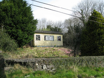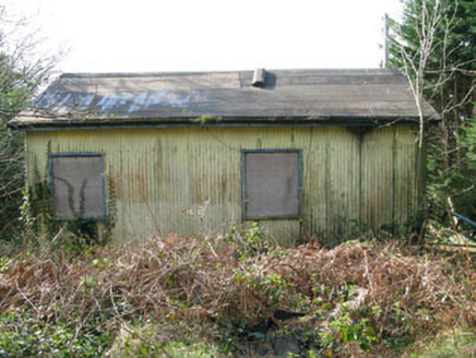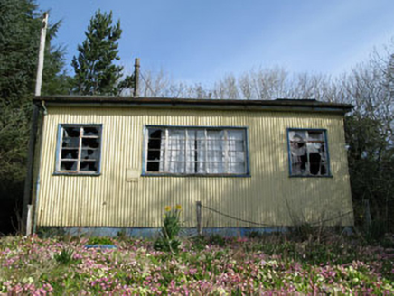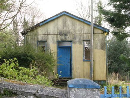 Detached gable-fronted three-bay single-storey school, built c.1950, now vacant. Pitched asphalt roof with cast-iron rainwater goods. Corrugated-iron walls. Square-headed openings with metal casement windows and timber sills. Square-headed door opening with timber battened door, overlight and concrete steps. Rendered walls to front and sides of plot with wrought-iron gate.
