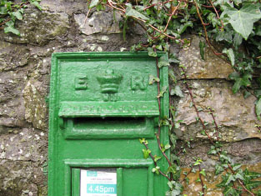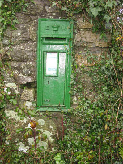 Wall-mounted cast-iron post box, installed c.1905, with crown and royal insignia of King Edward. Set in rubble stone pier.