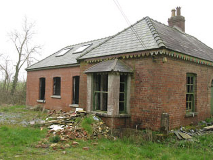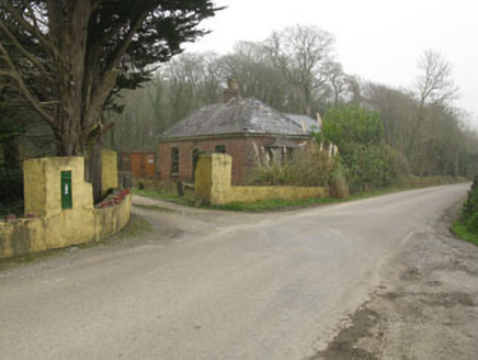 Detached three-bay single-storey gate lodge, built c.1900, having canted bay windows to sides (north-east, south-west) and recent addition to rear (south-east). Now disused. Hipped slate roof having red brick chimneystack and carved timber eaves boards. English bond red brick walls with lined-and-ruled rendered plinth. Camber-headed window openings with concrete sills, red brick voussoirs and remains of six-over-six pane timber sliding sash windows. Square-headed window openings to canted bays, having render sills and surrounds with remains of one-over-one and two-over-two pane timber sliding sash windows. Round-headed door opening having red brick voussoirs, render hood moulding and stepped approach with timber battened door and tympanum. Concrete enclosing wall to north-west having lined-and-ruled rendered gate piers.