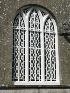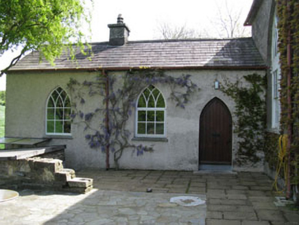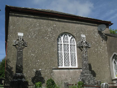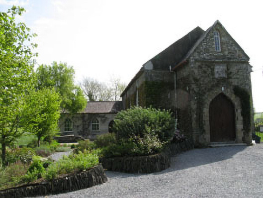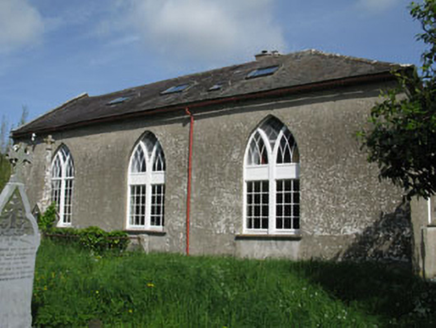 Freestanding gable-fronted barn style former Church of Ireland church, built c.1800. Comprising three-bay double-height nave, single-bay full-height porch to front (west) and later wing to north-west. Pitched and half hipped slate roofs with rendered chimneystacks, rooflights and cast-iron rainwater goods. Rubble stone walls to porch and front elevation of nave, having carved stone string course to base of gables and tooled limestone plaque to porch. Rendered walls to side (south, north) and rear elevations. Roughcast rendered walls to wing. Pointed arch window opening with limestone sill and timber casement window to gable of porch. Pointed arch window openings with stone sills to side elevations of nave having paired square-headed six-over-six pane timber sliding sash windows surmounted by timber Y-tracery overlights. Round-headed window opening with limestone sill to rear elevation having timber framed tripartite windows with Y-tracery and quarry glazed lancet windows with cast-iron window guards having fleur-de-lis decoration. Pointed arch window openings with limestone sills having replacement timber casement windows with overlight having timber Y-tracery to vestry. Pointed arch door opening with tooled stone block-and-start surrounds and voussoirs to porch having double-leaf timber battened doors. Pointed arch door opening to vestry having stone stepped approach and timber battened door. Set within own grounds with adjacent burial ground. Rubble stone boundary wall to front having rendered gate piers and wrought-iron gate.