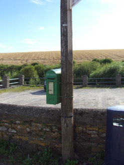 Cast-iron post box attached to timber post, erected c. 1950, with 'P&T' Gaelic script cast in relief.