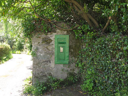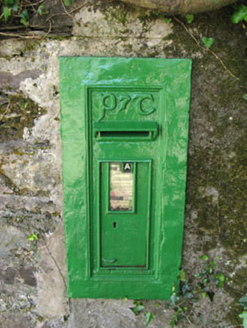 Wall-mounted cast-iron post box, c.1940, with P&T and manufacturer’s insignia. Rectangular aperture and display panel enclosed by raised reveal. Set into boundary wall at roadside.