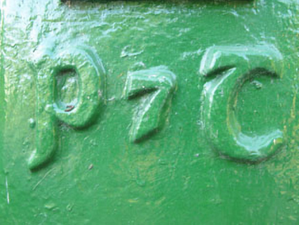 Round-headed wall-mounted cast-iron post box, installed c.1935, having 'P & T' emblem in relief.