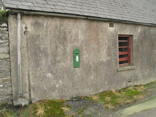 Wall-mounted cast-iron post box, installed c.1940, having panel detailing and raised lettering to door. Set within rendered wall of outbuilding.