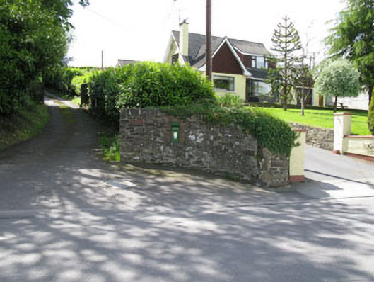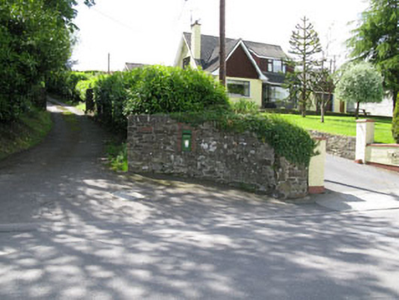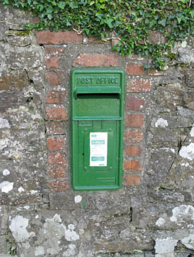 Wall-mounted cast-iron post box, installed c.1960, having raised lettering and panel detailing in relief.