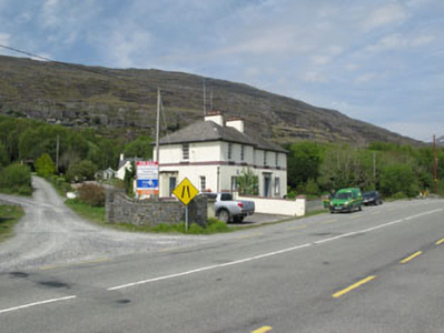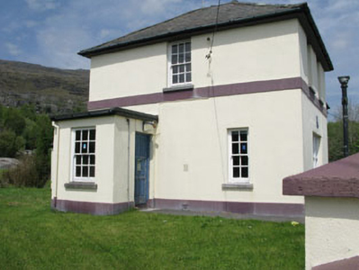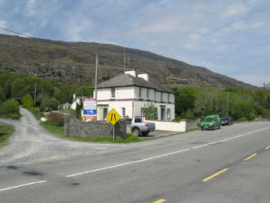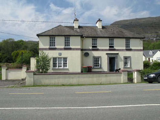 Detached L-plan four-bay two-storey Garda station, built c.1930, having projecting bay to west. Hipped slate roofs having rendered chimneystacks with cast-iron and uPVC rainwater goods. Painted rendered walls with platband and rendered plinth. Square-headed openings with six-over-six timber sliding sash windows, concrete sills and raised limestone surrounds (ground floor). Square-headed opening with tripartite four-over-four timber sliding sash windows and concrete sill. Square-headed door opening with timber panelled door, limestone step and raised limestone surround supporting entablature. Outbuildings to rear (north-west). Rendered walls with piers and wrought-iron gates to front.