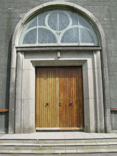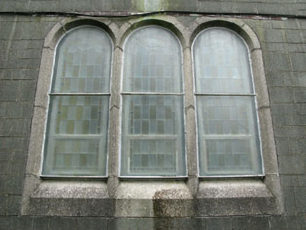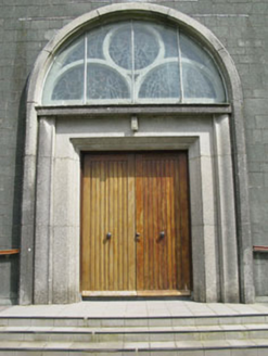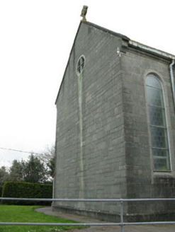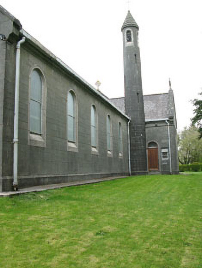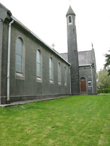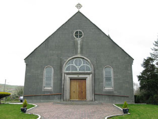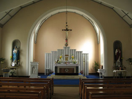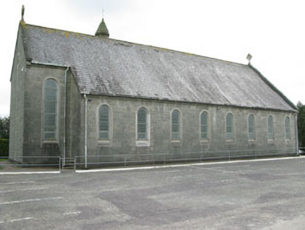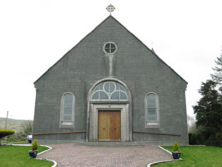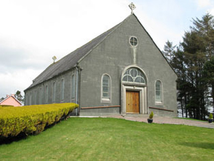 Freestanding gable-fronted three-bay double-height Roman Catholic church, built 1954, comprising eight-bay nave, single-bay chancel and single-bay sacristy to east, and three-stage bell tower to south-east. Pitched slate roof with cast-iron rainwater goods and cross finials to gables (east and west). Conical concrete capping to tower. Concrete block walls with plinth. Round-headed openings with fixed pane stained glass windows, concrete sills and chamfered concrete surrounds. Round-headed door opening, with raised render surround, stained glass fanlight with circular and semi-circular tracery set over timber battened double-leaf doors having moulded render surround and flanking pilasters supporting cornice. Enclosed by metal railings and stone walls.