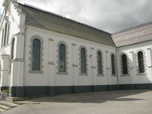 Located close to the other significant twentieth century public building, the primary school, and set on a slightly elevated position within Drinagh village, this handsome church is a notable addition to the streetscape. While its cruciform-plan is typical of the latter part of the nineteenth century, its profusion of external decorative detail identifies it as a later building. It marks a departure from the popular Gothic Revival style, and draws much inspiration from the Romanesque style, with round-headed arches, stout columns and the chevron motif.