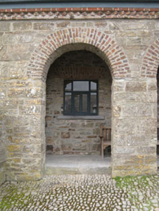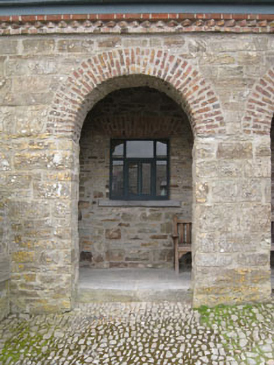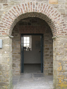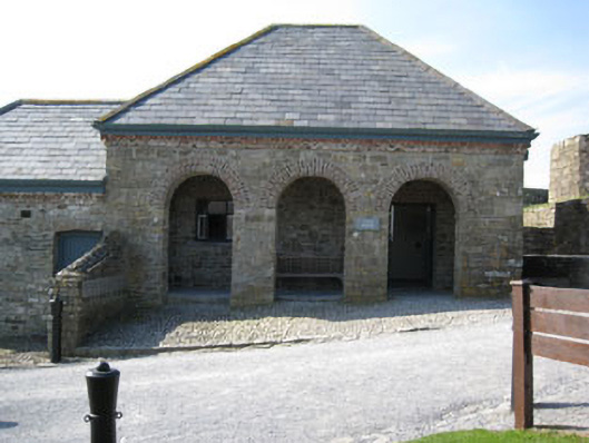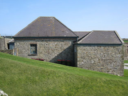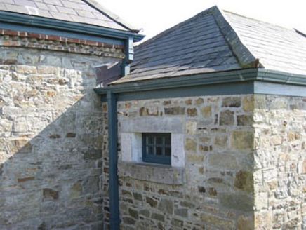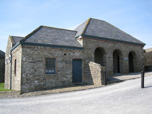 Detached five-bay single-storey former guard house, built c.1820, comprising three-bay block with arcade to northern end, with lower two-bay block to southern end, and having later extension to rear (west). Now in use as ticket office and information point. Hipped slate roofs with red brick dog-tooth over sailing eaves course, aluminium rainwater goods and recent rooflights. Rubble stone walls with projecting plinth wall to front elevation. Square-headed window openings with stone sills, having red brick voussoirs and block-and-start surrounds, three-over-six pane timber sliding sash windows to side (south) and front (east) elevations with timber occasional timber casements to front elevation. Square-headed cell window openings to rear extension with dressed limestone surrounds. Red brick round-headed arches springing from rubble stone piers to arcade. Square-headed door opening to interior of arcaded section, having red brick voussoirs and cut limestone step, with replacement double-leaf glazed timber doors. Camber-headed door opening to front elevation having red brick voussoirs and replacement timber battened door. Cobbled surface to front and side (north). Remains of hexagonal plan rubble stone water tower plinth-height foundations to side (north).