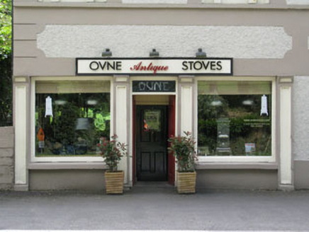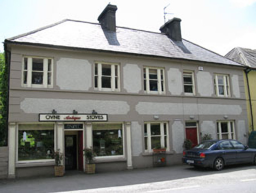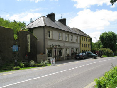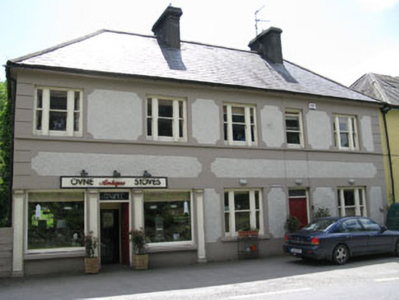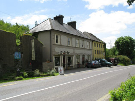 Attached five-bay two-storey over basement house and shop, built c.1920, having three-storey elevation and recent timber balcony to rear (south). Render shopfront to eastern end of front elevation. Hipped slate roof with rendered chimneystacks and eaves course, having cast-iron rainwater goods. Rendered walls throughout, having roughcast render panels and rendered quoins to front (north) elevation. Rendered sill course to first floor of front elevation. Square-headed window openings with stone sills throughout, having tripartite timber framed windows to front elevation with one-over-one pane timber sliding sash windows. Single one-over-one pane timber sliding sash window to first floor of front elevation. One-over-one pane timber sliding sash windows, bipartite timber framed windows with one-over-one timber sliding sash windows and replacement timber casement windows to rear elevation. Square-headed door openings throughout, having rendered surround, single-pane overlight and timber panelled door to front elevation. Double-leaf glazed timber doors with replacement overlights to first floor of rear elevation. Timber panelled door to ground floor of rear elevation. Rendered shopfront comprising panelled pilasters surmounted by timber fascia board with raised lettering. Square-headed window openings with stone sills and timber framed display windows over rendered stall risers. Square-headed door opening with stained glass overlight and double-leaf timber panelled doors. Former mill to side (east). Set along roadside.