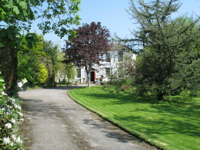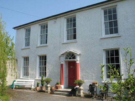 Detached formerly T-plan five-bay two-storey house, built c.1780, with later extensions to rear (north-west). Hipped artificial slate roof with rendered chimneystack and uPVC rainwater goods. Roughcast rendered walls with smooth rendered plinth and vertical corner plat bands. Square-headed openings having six-over-six timber sliding sash windows with painted stone and concrete sills. Pediment doorcase, comprising engaged Ionic columns flanking round-headed cob web fanlight and recessed timber panelled door with panelled reveals, approached by limestone steps.
