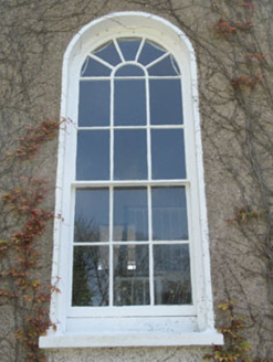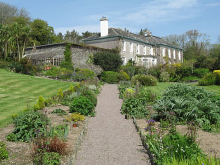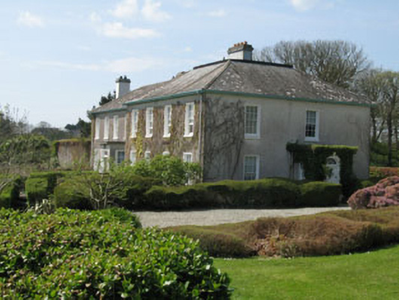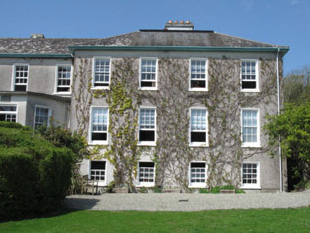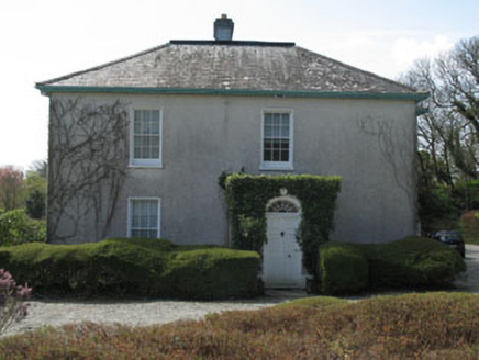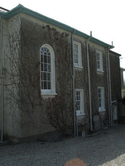 Detached two-bay two-storey over basement former rectory, built c.1810, having four-bay side elevations, flat roofed porch addition to entrance (north) and five-bay two-storey wing addition to south. Now in use as private house. Hipped slate, asphalt and copper alloy roofs with rendered chimneystack, timber eaves course and cast-iron and uPVC rainwater goods. Roughcast and smooth rendered walls having plinth, with platband and concrete moulding to porch. Square-headed and round-headed openings with six-over-six timber sliding sash and fixed pane windows with concrete sills, raised rendered surrounds and internal shutters. Round-headed door opening with timber panelled door having fluted panels, spoked fanlight and raised rendered surround. Located in extensive landscaped grounds with dry stone boundary walls. Entrance comprising roughcast rendered walls, cut block sandstone piers, capstones and wrought-iron gates.