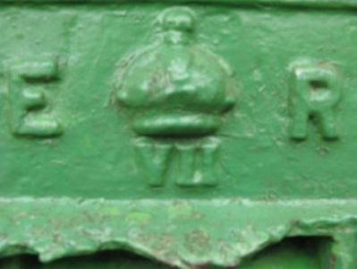 This fine post box, with its simple design, is an interesting example of early twentieth-century mass-produced cast-iron street furniture. The raised lettering and royal cipher enhance the artistic quality of the composition and allow it to be dated to the reign of British monarch Edward VII.