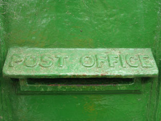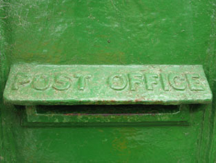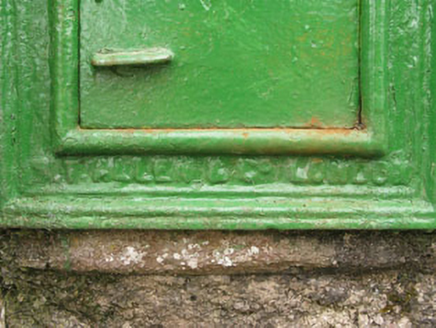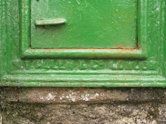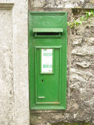 Wall-mounted cast-iron post box, installed c.1880, having canopied letter slot with raised lettering reading ‘Post Office’ and embossed manufacturer's mark 'W.T. Allen & Co. London'. Set in rubble limestone wall.