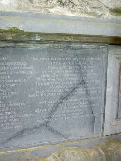 Freestanding mausoleum, built 1754, comprising rectangular-plan single-bay pedimented building. Rubble stone walls and roof. Elliptical-headed arch having cast-iron railings to north elevation. Recumbent female figure set on limestone pedestal with engraved plaques. Plaques in tripartite arrangement behind statue.