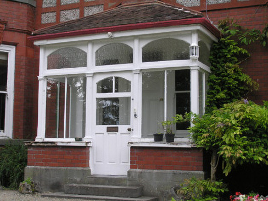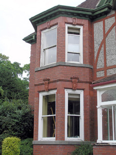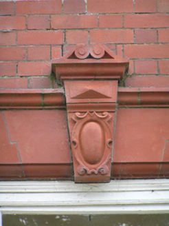 Detached L-plan three-bay two-storey house, built 1901, with a pair of two-storey three-sided canted bays, an entrance porch and a central gable. Hipped terracotta tiled roof with terracotta finials and three red brick chimneystacks, gabled to the return. Cast-iron rainwater goods on overhanging eaves with modillions and stringcourse below. Red brick walls laid in Flemish bond with a soldier quoin detail to the corners, with a strutwork finish to the first floor between to canted bays only. Square-headed window openings with gauged terracotta lintels having decorative terracotta keystones to the canted bays only, with single-pane timber sash windows and architrave surrounds on continuous limestone sill courses. To the central gable is a bipartite window opening with single-pane timber sash windows and a tiled canopy above supported on timber sprockets and limestone corbels. To the rear is a square-plan flat-roofed section, possibly containing the stairwell with a large brick round-arched window opening with a uPVC window. All other window openings being gauged brick flat-arched with single-pane timber sash windows and some uPVC replacements. Timber-framed porch on a low brick wall with a limestone plinth and steps. Within the porch is a square-headed door opening with a flat-panelled timber door flanked by a pair of single-pane timber sash windows and an overlight above. A modern single-storey extension attached to the south built c. 2000. A gravel drive leads through a landscaped site with modern red brick piers and a further pedestrian entrance with stone pediment and a tongued and grooved timber door.