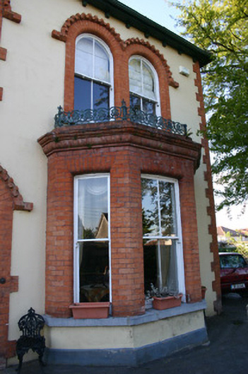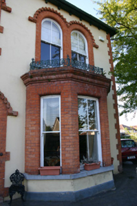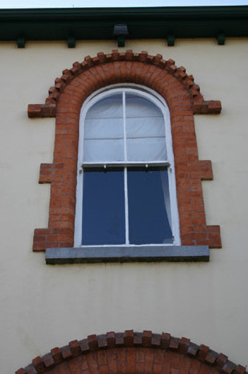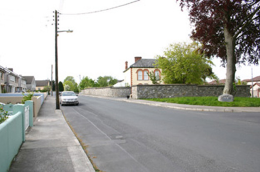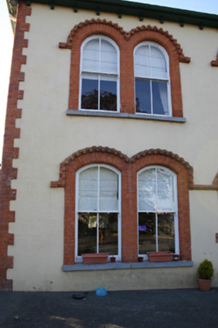 Detached three-bay two-storey rendered house, built c. 1885, distinguished by paired arched window and door openings with red brick surrounds. Lean-to accretion to rear. Conservatory to west, c. 2000. Hipped slate roof with central valley, with bull nose moulded clay ridge tiles. Timber sprocketed eaves, with uPVC rainwater goods. Four chimneystacks faced with red brick laid in Flemish bond with stringcourses and brick corbelled coping having concrete flaunching and plain clay pots. Smooth rendered front and side elevation with red brick quoins. Roughcast rendered rear elevation. To first floor paired and single round-arched window openings with red brick surrounds, detailed red brick drip mouldings limestone sills and two-over-two timber sash windows, with arched upper sashes and ogee horns. Paired segmental-arched window opening to ground floor with surround and sash windows as above. Single-storey three-sided canted bay window with rendered base, continuous limestone sill, red brick piers and parapet cornice with cast-iron cresting. Two-over-two and single-pane timber sash windows with ogee horns. Plain square-headed and round-arched window openings elsewhere with rendered reveals, limestone sills, two-over-two, three-over-six and six-over-six timber sash windows some with ogee horns. Segmental-arched door opening with red brick surround as per windows, tripartite timber doorframe forming sidelights over panelled bases, plain segmental fanlight and flat-panelled timber door leaf, opening onto encaustic tile entrance platform. Intact interior with Victorian tilework to entrance hall. Original joinery details evident. Site enclosed by late twentieth-century rubble limestone faced boundary wall entered through rusticated limestone gate piers with wrought-iron railings, having integrated dog guard rail and cast-iron finials.