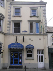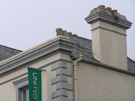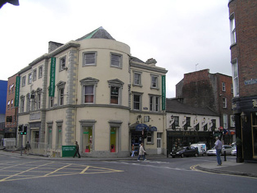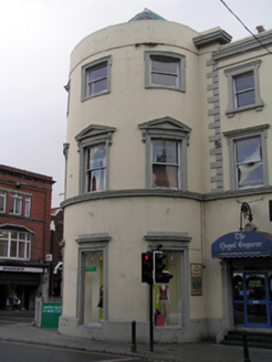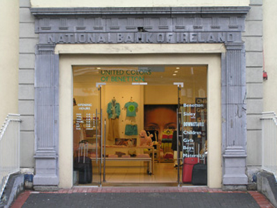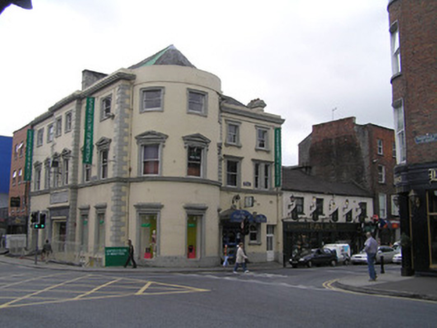 Corner-sited attached six-bay three-storey over basement former bank building, built c. 1880, possibly incorporating a number of earlier structures. Distinguished by a full-height two-bay entrance breakfront and full-height three-bay bow to the north-facing side elevation, and two-bay three-storey return facing Henry Street. Hipped artificial slate main roof with a semi-conical slate roof over bow end bay, with copper flashing lining the junction of the two. Two rendered chimneystacks, plain to main roof, and having heavy cornice and flaunching to south wall of return. Painted ruled and lined rendered walls throughout with stucco detailing comprising rusticated quoining, and parapet entablature. Square-headed window openings throughout, with bipartite openings to return, each having a moulded stucco architrave, lugged to second floor, triangular pediments with console brackets to first floor, and plain entablature to ground floor, shouldered architraves to return openings, all with painted sills, and continuous sill course returning around bow and return elevation at first floor level. One-over-one timber sash windows throughout with ogee horns, all c. 1950. Sill levels dropped at ground floor level to bow, forming display windows, c. 1990. Centrally-placed square-headed door opening to breakfront, with Classically inspired limestone doorcase comprising fluted Doric pilasters on plinth base joined by Doric entablature, elongated beneath the frieze to form a name plate with raised limestone lettering reading: National Bank of Ireland. Opening onto a brick paved entrance platform flanked by limestone plinth wall with wrought-iron railings, which returns to enclose front site basement area. Segmental-headed door opening to return with moulded surround comprising part fluted Doric pilasters joined by segmental-arched archivolt, with modern canopy and glazed timber doorframe and door leaf, opening onto original limestone steps.