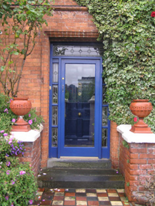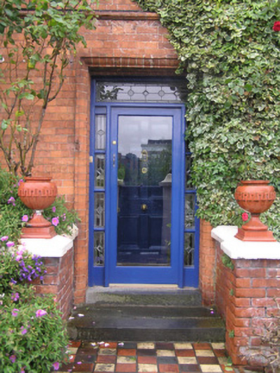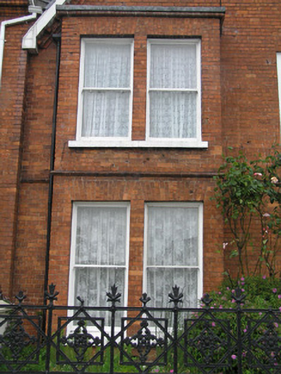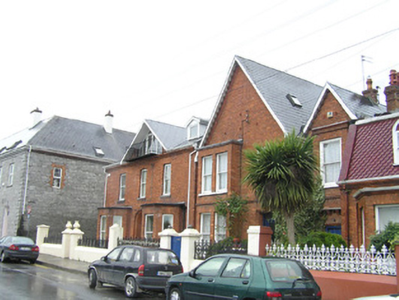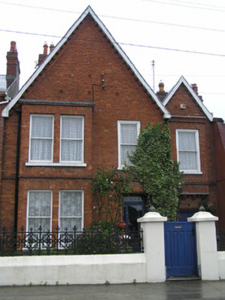 Attached two-bay two-storey red brick house, built c. 1890, distinguished by steeply pitched gabled front elevation with a recessed gabled single-bay elevation to northeast, having corbelled oriel window over door to rear site. Single-storey accretion to rear, c. 2000. Pitched artificial slate roofs with two red brick chimneystacks and clay pots. uPVC rainwater goods and uPVC bargeboards on brick corbelled gable with terracotta rosette detail. Red brick front elevation laid in English garden wall bond with terracotta rosette plaques and decorated vent bricks to main gable elevation. Two-storey three-sided red brick bay window to principal elevation with moulded brick stringcourse delineating floor levels, with paired square-headed openings having red brick flat arches, reveal, joined painted sills and one-over-one timber sash windows. Oriel window to recessed bay with limestone plate base supported by moulded brick corbels. Square-headed window opening to this and opening over front door with red brick flat arches, reveals, painted sills and one-over-one timber sash windows with exposed timber sash boxes. Replacement two-over-two and two-over-one timber sash windows and replacement uPVC windows to rear elevation. Square-headed recessed porch opening and service door opening, each with an ovolo moulded surround. Porch closed by timber porch doorframed, c. 2000, comprising side and overlight and glazed timber door. Original flat-panelled timber front door leaf visible. Porch arrived at by two limestone steps flanked by red brick plinth walls with painted masonry copings. Plank timber door leaf to side door opening. Tiled front site path. Site enclosed by rendered plinth wall supporting elaborate cast-iron railings, with terminating rendered piers forming pedestrian gate closed by panelled timber gate.