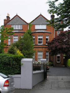 Semi-detached two-bay three-storey red brick house, built c. 1900, facing south with a two-storey three-sided canted bay window to gabled breakfront, paired with neighbouring breakfront. Single-bay two-storey gabled return to rear. Pitched artificial slate roof with intersecting pitched breakfront roof. Rendered chimneystack to breakfront with moulded clay pots. Cast-iron rainwater goods. Red brick chimneystack to gable of side elevation with red brick stringcourse. Red brick walls laid in English garden wall bond with weather hung fishscaled slate to gable of breakfront. Moulded brick eaves throughout. Cement rendered rear and return elevations. Square-headed window openings with red brick flat arches, reveals, limestone sills with sill course to bays, red brick reveals, and single-pane timber sash window, with twelve-paned overlights. Three-sided canted bay window to rear with timber sills, rendered apron lead covered roof, and single-pane timber sash windows with ogee horns and cylinder glass. Square-headed door opening to side of breakfront, set in shallow porch, with bull nose moulded reveals to limestone lintel, and red brick reveals, limestone step, original flat-panelled and glazed timber door leaf. Overlight over door lintel with matching bull nose lintel and tripartite arched overlight. Site enclosed from pavement by rendered plinth wall with replacement rendered plinth walls, piers and entrance. Hard landscaped front site with landscaped area.