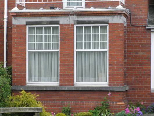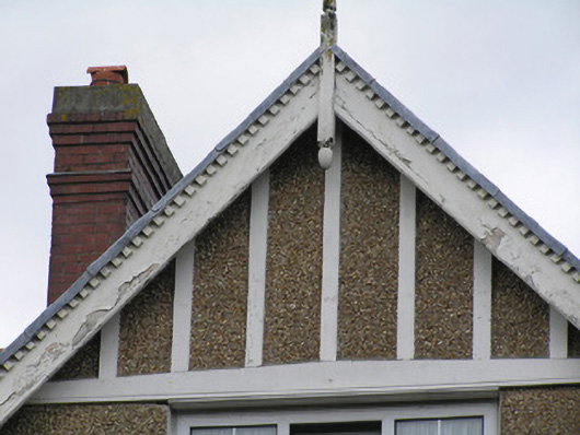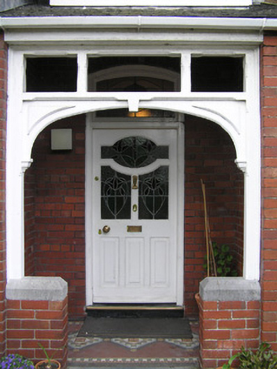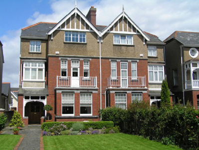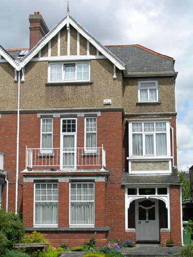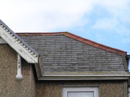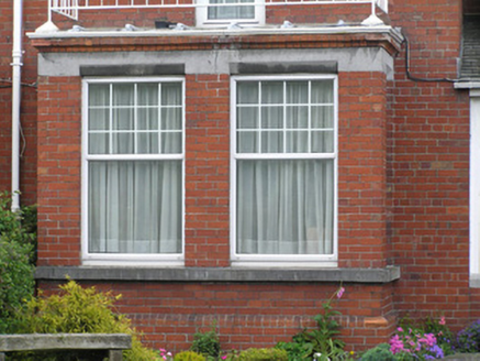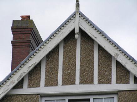 Semi-detached two-bay three-storey red brick and pebbledash rendered house, built c. 1910, with facing south with a three-sided bay window to full-height gabled breakfront, and entrance porch with three-sided bay window above. Two-storey return flush with side elevation, prolonged by single-storey extension. Hipped gabled slate roof with terracotta ridge tiles and large red brick chimneystacks shared with neighbour. Dormer to rear span. Original detailed timber bargeboard with finial to apex. Timber brackets on painted stone corbels support eaves. Cast-iron rainwater goods. Red brick walls to ground and first floor of façade, side elevation and entire rear elevation, laid in English garden wall bond with profiled limestone ashlar stringcourse delineating second floor level, which is faced in pebbledash render. Cement rendered return walls. Applied timber struts to gable elevation. Single-storey red brick three-sided bay window with balcony above having replacement metal balustrade, incorporating square-headed window openings with red brick reveals, continuous stop-chamfered limestone lintel and sill course. Square-headed window opening to second floor level with limestone sill having profiled soffit. Three-sided bay window over porch door with pebbledash rendered base, timber sill and hipped lean-to roof. Segmental-arched window openings to rear elevation. uPVC windows throughout. Square-headed door opening giving access to balcony over bay window flanked by sidelights with continuous stop-chamfered limestone lintel, uPVC door and windows. Entrance porch with red brick plinth sides having limestone coping with vertical timber supports joined by open panelled horizontal section and lean-to slate roof. Encaustic tile porch platform. Segmental-arched front door opening with red brick arch and reveals, panelled timber door leaf with leaded coloured glass. Segmental overlight with leaded coloured glass. Large front site enclosed by snecked and coursed limestone walls with limestone ashlar coping and wrought-iron railings with cast-iron gate post on which is hung a wrought-iron pedestrian gate. Tarmacadam front site path to front door.