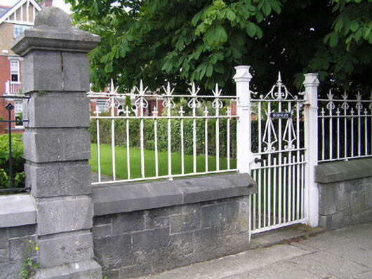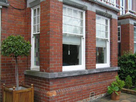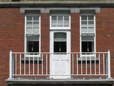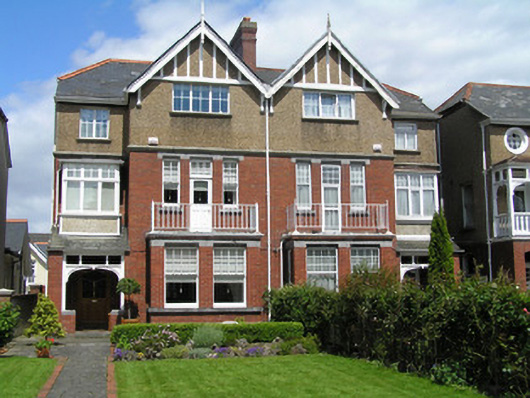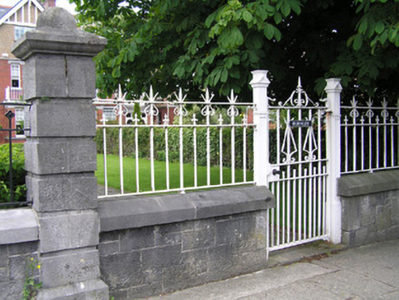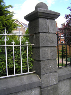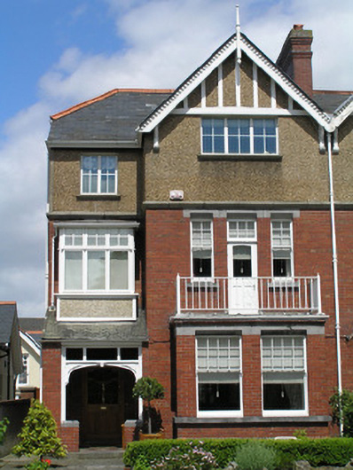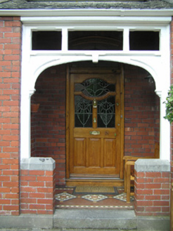 Semi-detached two-bay three-storey red brick and pebbledash rendered house, built c. 1910, facing south with a three-sided bay window to full-height gabled breakfront, and entrance porch with three-sided bay window above. Two-storey return flush with side elevation, prolonged by single-storey extension. Hipped gabled slate roof with terracotta ridge tiles and large red brick chimneystacks shared with neighbour. Dormer to rear span. Reproduction timber bargeboard with finial to apex, c. 2000. Timber brackets on painted stone corbels support eaves. uPVC gutters and cast-iron downpipes. Red brick walls to ground and first floor of façade, side elevation and entire rear elevation, laid in English garden wall bond with profiled limestone ashlar stringcourse delineating second floor level, which is faced in pebbledash render. Cement rendered return walls. Applied timber struts to gable elevation. Single-storey red brick three-sided bay window with twelve-over-one and six-over-one timber sash windows. Balcony above having replacement metal balustrade, incorporating square-headed window openings flanking door opening, with continuous stop-chamfered limestone lintel, red brick reveals and sill course and glazed timber-panelled door with six-over-one timber sash windows having ogee horns. One-over-one margin-paned timber sash window with coloured and frosted glass to square-headed window on side elevation. Some cylinder glass surviving. Three-sided bay window over porch door with pebbledash rendered base, timber sill, hipped lean-to roof and reproduction side-hung casement windows with four-pane overlights. uPVC windows to attic level and rear elevation. Entrance porch with red brick plinth sides having limestone coping with vertical timber supports joined by open panelled horizontal section and lean-to slate roof. Encaustic tile porch platform. Segmental-arched front door opening with red brick arch and reveals, panelled timber door leaf with leaded coloured glass. Segmental overlight with leaded coloured glass. Large front site enclosed by snecked and coursed limestone walls with limestone ashlar coping and rusticated limestone ashlar pier, supporting wrought-iron railings with cast-iron gate post on which is hung a wrought-iron pedestrian gate. Tarmacadam front site path to front door.
