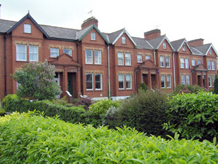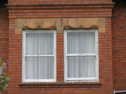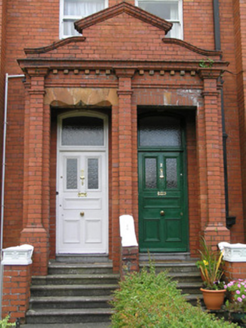 End-of-terrace three-bay two-storey over basement red brick house, built c. 1900, facing north having a gabled breakfront with attic second floor level, and shared pedimented doorcase. Two-storey return shared with neighbouring house. Pitched artificial slate roof with terracotta ridge tiles. Replacement timber bargeboard, and original finial to gable apex. Red brick chimneystack to party wall and gable of return, with stringcourse and concrete capping to front chimneystack, moulded clay pots to return only. Original square-profile cast-iron rainwater goods. Roof lights to rear span. Red brick walls laid in English garden wall bond with rendered basement elevation and moulded brick course delineating ground floor level. Roughcast rendered rear elevation. Square-headed window openings, forming pairs to breakfront and single opening over front door, each pair with red brick mullion pier, profiled terracotta lintels, moulded red brick sills, and single pane timber sash windows with ogee horns. Timber casement to attic window. Square-headed window openings to rear elevation, with camber-arched paired opening at ground floor level all with uPVC windows. Shared entrance porch arrived at by flight of nosed limestone steps with flanking red brick plinth wall with decorated terracotta capping to pier. Red brick porch comprises elongated pilaster supporting dentil cornice with curvilinear and triangular pediment above. Profiled lintel above glazed timber framed porch door. Tiled porch platform with original flat-panelled timber door having horizontal centre panel and glazed upper panels. Glazed segmental-arched overlight. Cast-iron railings and terminating replacement brick pier with original cast-iron gate. Path to front door and steps to basement level. Gated shared lane gives access to rear site.