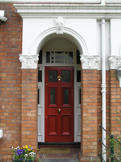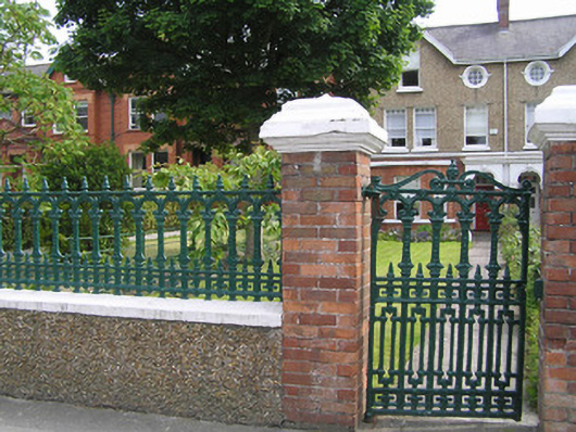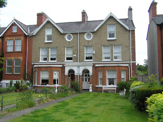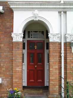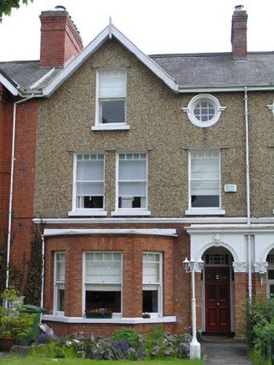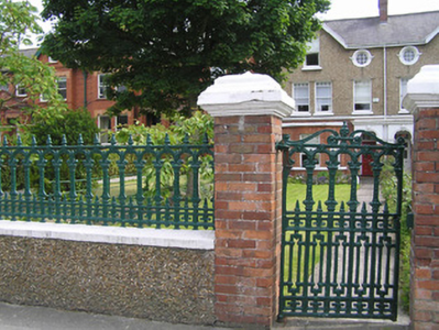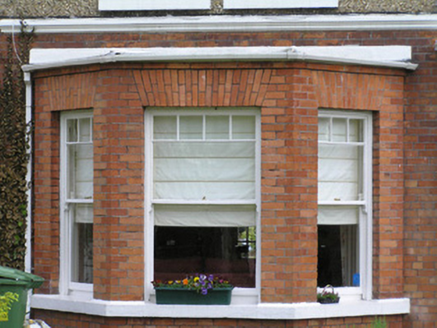 Terraced three-bay three-storey gable-fronted house, built c. 1925, facing north with a two-storey return shared with neighbouring house. Pitched natural slate roof with two red brick chimneystack, to party wall shared with neighbour. Replacement metal gutter and cast-iron downpipes. Red brick walls laid in English garden wall bond to ground floor terminating with a cornice at first floor level. Pebbledash rendered first and second floor elevations. Rendered side and rear elevations. Square-headed window openings, with concrete sills and one-over-one timber sash windows with margin-paned upper lights. Two-over-two timber sash windows to rear. An oculus window to second floor level with hood moulding and multiple-paned swivel timber window. Flat-roofed three-sided canted bay window to ground floor with gauged red brick flat arches, continuous sill course and windows as per upper floors. Round-headed porch door opening with on red brick pilasters with rendered capitals and archivolt having figurative keystone and cornice above, encompassing door opening of both houses. Square-headed door opening with glazed timber-panelled door with sidelights and overlight, c. 2004. Opening onto tiled area with limestone step and concrete path through front lawn. Enclosed from road by rendered wall with red brick piers having moulded capping stones and decorative cast-iron railing and pedestrian gates. Gravelled lane to west of neighbouring end-of-terrace house gives rear site access.