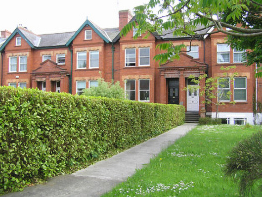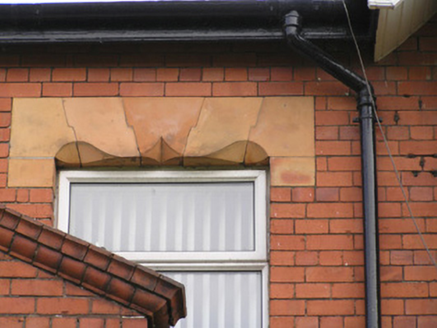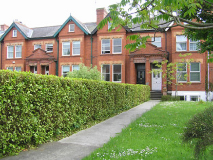 Terraced three-bay two-storey over basement red brick house, built c. 1900, facing north, having a gabled breakfront with attic second floor level, and shared pedimented doorcase. Two-storey return shared with neighbouring house. Pitched natural slate roof with terracotta ridge tiles, cement coping to gable. Red brick chimneystack to party wall with stringcourse and concrete flaunching. Red brick chimneystack to party wall of return, with moulded clay pots. uPVC rainwater goods. Red brick walls laid in English garden wall bond with rendered basement elevation and moulded brick course delineating ground floor level. Cement rendered rear elevation. Square-headed window openings, forming pairs to breakfront and single opening over front door, each pair with red brick mullion pier, profiled terracotta lintels, moulded red brick sills. Square-headed and segmental-headed window openings to rear elevation. All openings have uPVC windows. Shared entrance porch arrived at by flight of nosed limestone steps with flanking red brick plinth wall with decorated terracotta capping to pier. Red brick porch comprises elongated pilaster supporting dentil cornice with curvilinear and triangular pediment above. Profiled lintel above glazed timber framed porch door. Tiled porch platform with original flat-panelled timber door having horizontal centre panel and glazed upper panels. Glazed segmental-arched overlight. Concrete front site path to front door and steps to basement level. Painted rendered boundary plinth wall with cast-iron railings and terminating brick pier with replacement steel gate. Shared lane gives access to rear site between Moyola and Ardara Terraces.