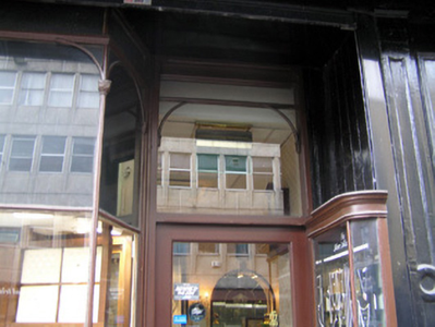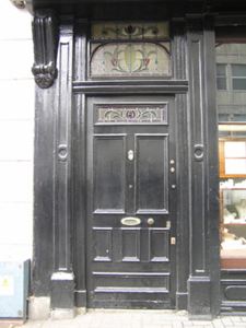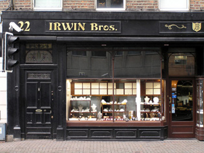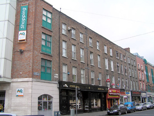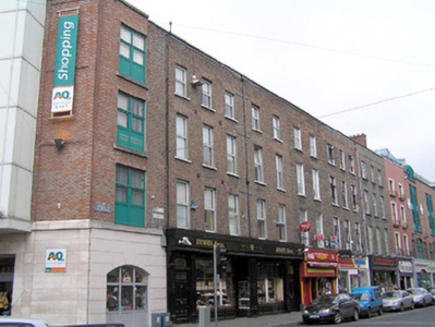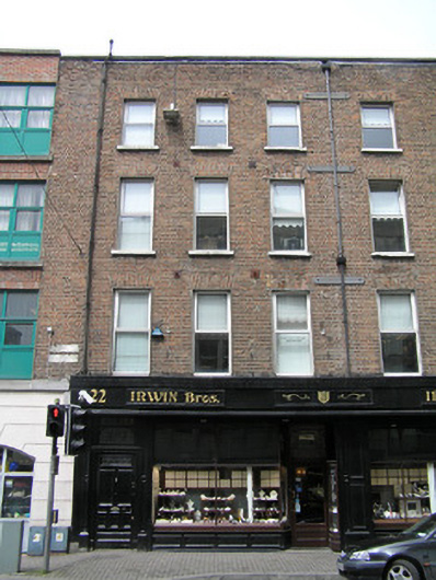 Terraced three-bay four-storey brown brick Georgian building, built c. 1780, distinguished by regular fenestration and a shopfront, introduced c. 1890, at ground level shared with neighbouring building. Roof hidden behind parapet wall, with coping and cast-iron rainwater goods. Brown brick walls laid in Flemish bond, with limestone coping to parapet wall; re-pointed using cement. Square-headed window openings with brick flat arches, patent rendered reveals, painted limestone sills and uPVC windows throughout. Symmetrical timber shopfront consisting of large fixed-pane display windows with timber colonnettes and arch detail. All on panelled timber shall risers. Recessed shop entrance with glazed timber door and overlight. Shop entrance with timber glazed door and overlight. Square-headed door opening to south with timber-panelled door with leaded glass panel. Decorative leaded coloured glass overlight. Flanked by timber pilasters and one console bracket supporting timber fascia above.