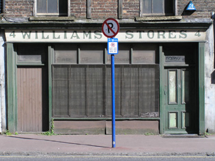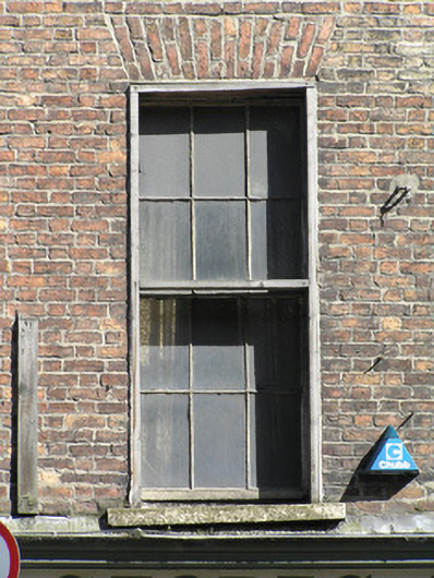 Terraced two-bay four-storey over concealed basement red brick building, built c. 1780, with a timber shopfront at ground floor level, c. 1880. Coach house to rear site lane. Pitched artificial slate roof concealed behind parapet wall with large red brick chimneystack to party wall, possibly rebuilt during the late nineteenth century. Square-headed window openings with red brick flat arches, rendered reveals, painted limestone sills, and six-over-six and three-over-six timber sash windows. Timber shoring to openings, c. 1980. Timber shopfront comprising fluted pilasters to either end supporting cornice fascia board with painted name plate. Two door openings each with overlight, one to shop floor and one accessing upper floors, flanking four-paned display window with metal sheet lining to stallriser. One flat-panelled timber door, contemporary with shopfront, and a plank timber door, c. 1980. Tensile cast-iron grille to pavement illuminates basement cellar. Gable-fronted single-bay three-storey rendered coach house possibly enlarged to form a commercial store, with roughcast rendered finish. Pitched slate roof with ridge perpendicular to lane.