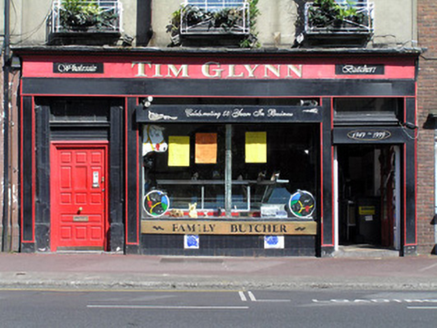 Terraced three-bay four-storey over concealed basement red brick building, built c. 1785, with original limestone doorcase incorporated within partially surviving nineteenth-century shopfront. Pitched artificial slate roof behind parapet wall with red brick chimneystack to south party wall and limestone coping to parapet wall. Façade faced in red brick laid in Flemish bond, with limestone coping to parapet wall; re-pointed in cement; cement render applied to elevation at first floor level. Square-headed window openings, red brick flat arches, patent cement rendered reveals, painted limestone sills, and replacement uPVC windows throughout. Nineteenth-century timber shopfront comprising original fascia board with enriched cornice standing on replacement or relined pilasters to either end. Timber-framed display window with tiled stallriser and metal roller shutter blind, c. 1990. Shopfront incorporates original eighteenth-century painted limestone lugged and kneed architrave doorcase with original multiple-panelled raised and fielded panelled timber door with four-pane overlight.