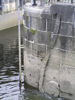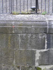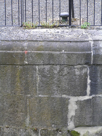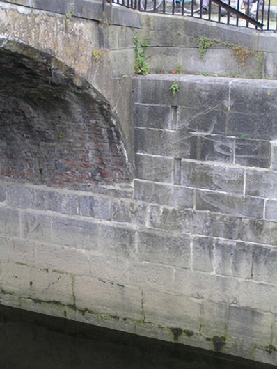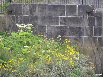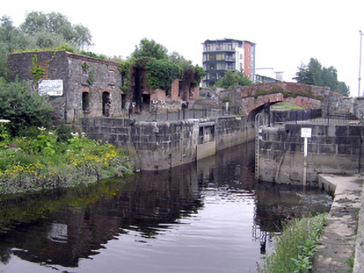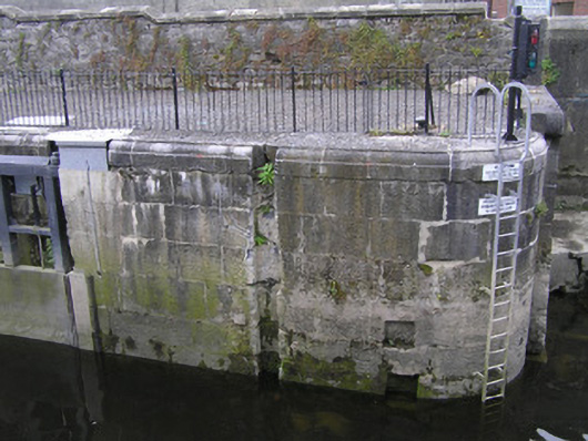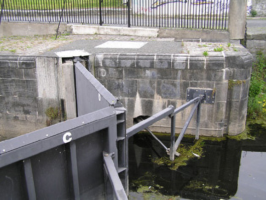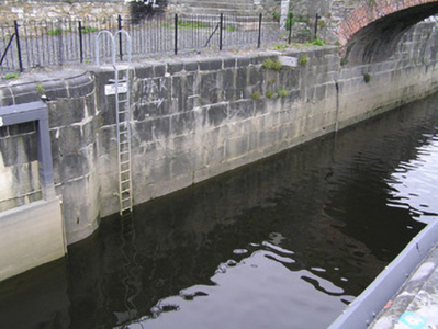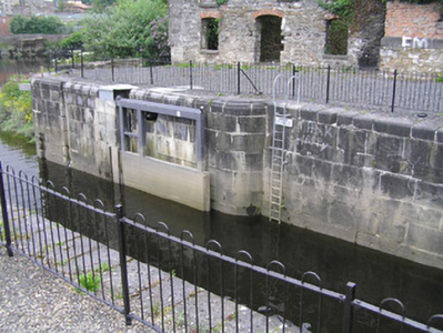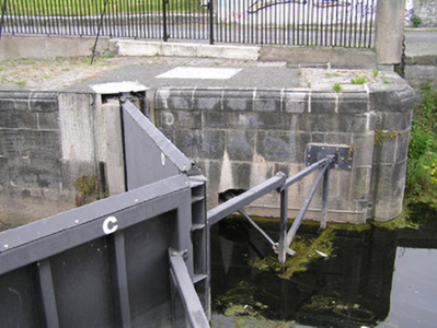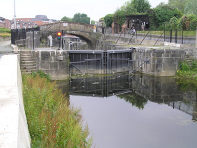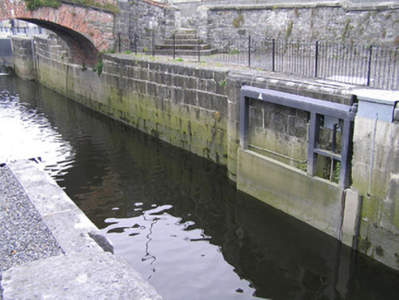 A solid ashlar limestone lock, recently restored, with a pair of very attractive walls facing the river. Together with the two buildings to the north and the brick hump-back bridge they form a most pleasant feature on the canal. The S-scroll piers are distinctly Baroque in origins. The construction of the canal marked a further advancement of the City beyond the walls.