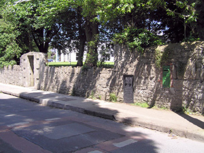 Wall-mounted cast-iron post box, erected c. 1910, on a rubble stone wall forming the boundary wall to Derravoher House, with raised ER VII royal cipher with small crown motif. Saorstat Eireann insignia with harp below. Red brick surround.
