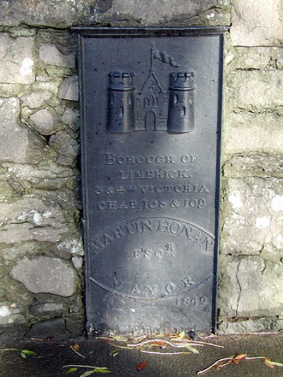 Upright cast-iron borough boundary marker, erected in 1842, and set into the wall on the North Circular Road. It reads: Borough of Limerick. 3 & 4 " Victoria Chap, 108 & 109 Martin Honan Esqr. Mayor 1842'. Relief on the front of the marker depicts the arms of the city: showing a twined curved castle walls with battlements which flank a gabled entrance. Pointed arched entrance doorway with three-light window above, surmounted by a flying flag at the apex of the gable. Gun loops on the façade of the entrance bay complete the setting of the relief. The name of the manufacturer, at the base of the marker, is obscured due to the resurfacing of the footpath.