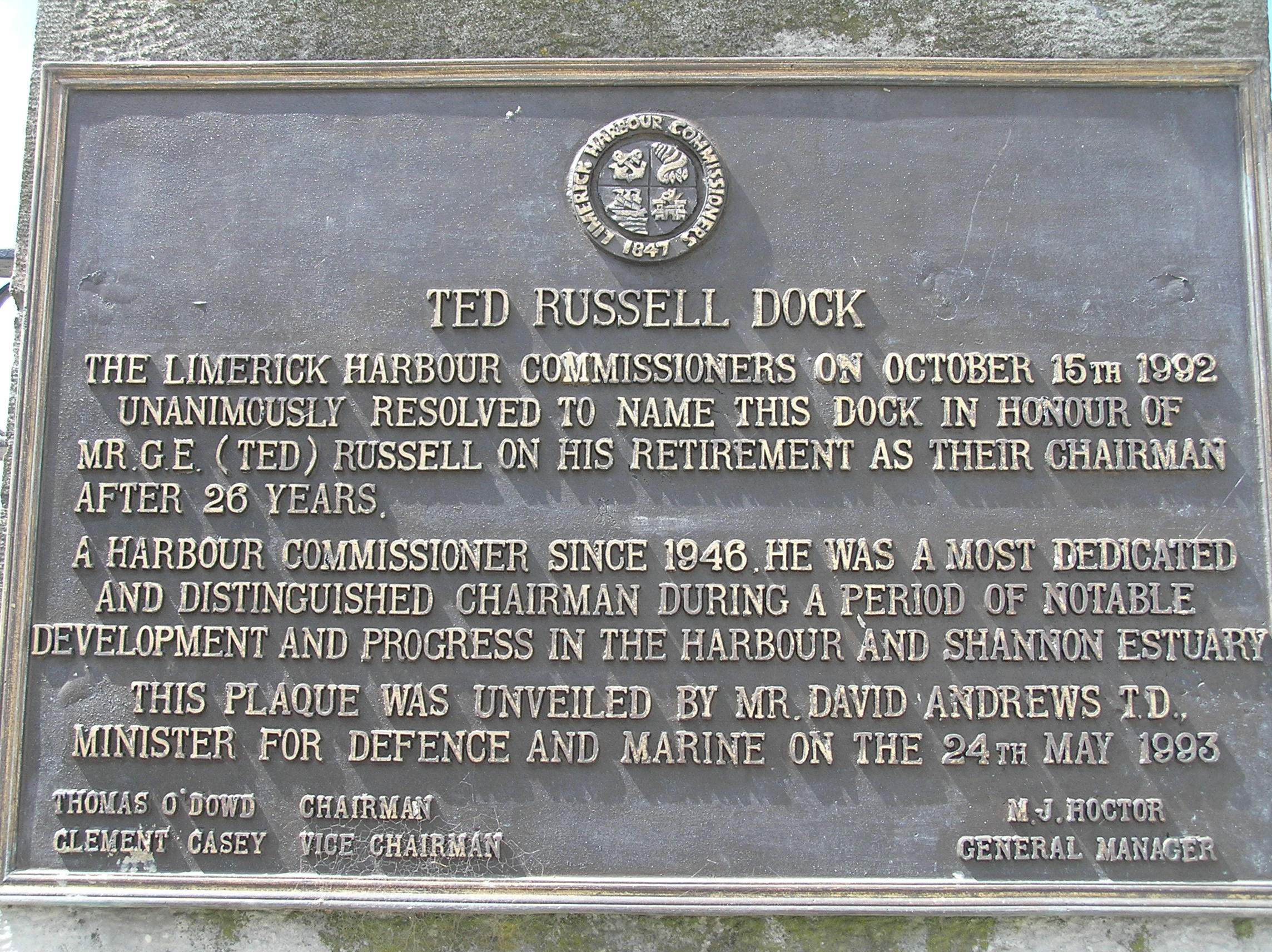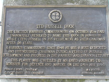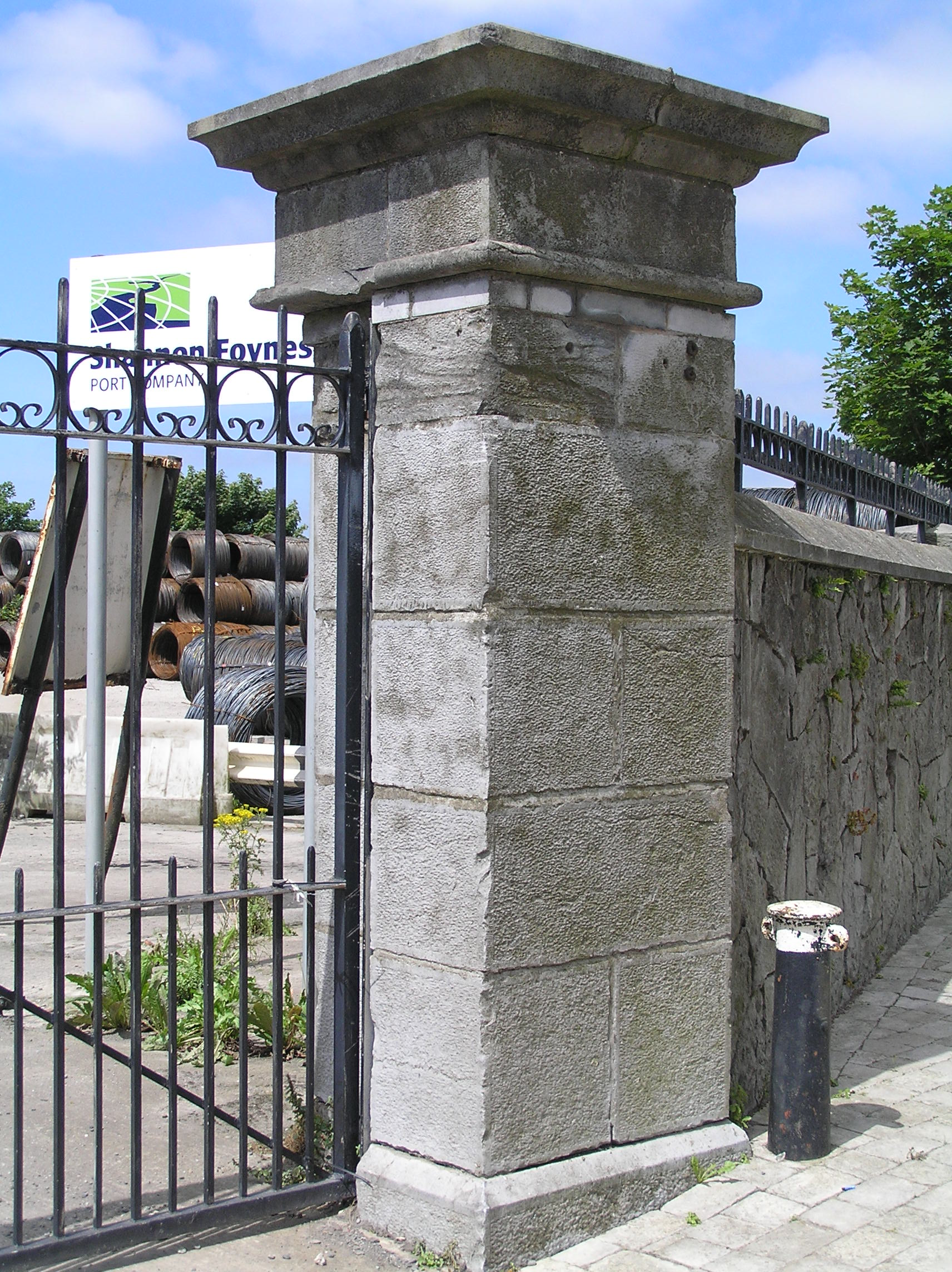Gateway to dock yard, erected in 1853, and repositioned at its current location, angled to O'Curry Street, during the twentieth century. Three square-plan ashlar limestone piers with chamfered plinth base and stringcourse beneath shallow pyramidal capping stone forming two gate openings with mild steel gates. Curving rubble limestone plinth walls supporting mild steel railings to east and west are of recent origins. A commemorative plaque to one pier, announces the date of renaming the piers after Ted Russell.