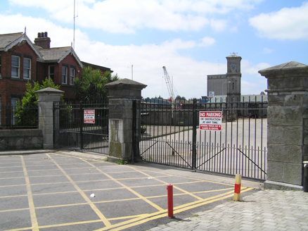 This fine set of nineteenth-century piers have been repositioned and once formed a pedestrian gate and vehicular gateway. The gates give access to this historic dock yard which retains a harbour master's house, a fine Italianate clock tower and a graving dock. The competition for the floating dock was held on the 26th September 1853.