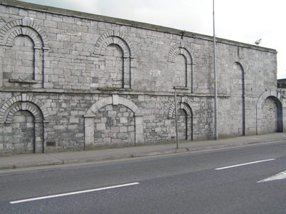 Freestanding section of limestone wall to Dock Road, erected c. 1880, with several blind arched openings. Squared and coursed limestone ashlar wall, limestone coping with later mortar flaunching above. To the northeast is a segmental-arched opening, expressed with a Baroque vigour, and now blocked up, with rusticated piers and imposts supporting a rusticated arch voussoirs radiating before squaring off with a plain stringcourse. Large keystone to centre of arch. Later squared, coursed and snecked limestone infill. This is repeated on the inner face of the wall. Further south is a three-bay, two-storey composition with limestone ashlar platband delineating the first level and parapet wall. Elevation is comprised of blind round-arched openings, each with an inner and outer arch on different planes, with rusticated voussoirs and a sill to the inner arch, set lower than flanking sills, and which spans the entire opening of the centrally-placed opening. Segmental-arched blind opening at ground floor level with smooth limestone ashlar piers, imposts, voussoirs, and keystone. Further south is a double-height blind arch and a further single-height segmental arch with smooth limestone ashlar surround. At the entrance to the site the wall continues at a ninety-degree angle and meets a triple-height limestone ashlar wall with a platband to each level continuing around two triple-height pilasters. To the upper stage is a set of three semicircular openings with vermiculated rusticated voussoirs with red brick soffits.