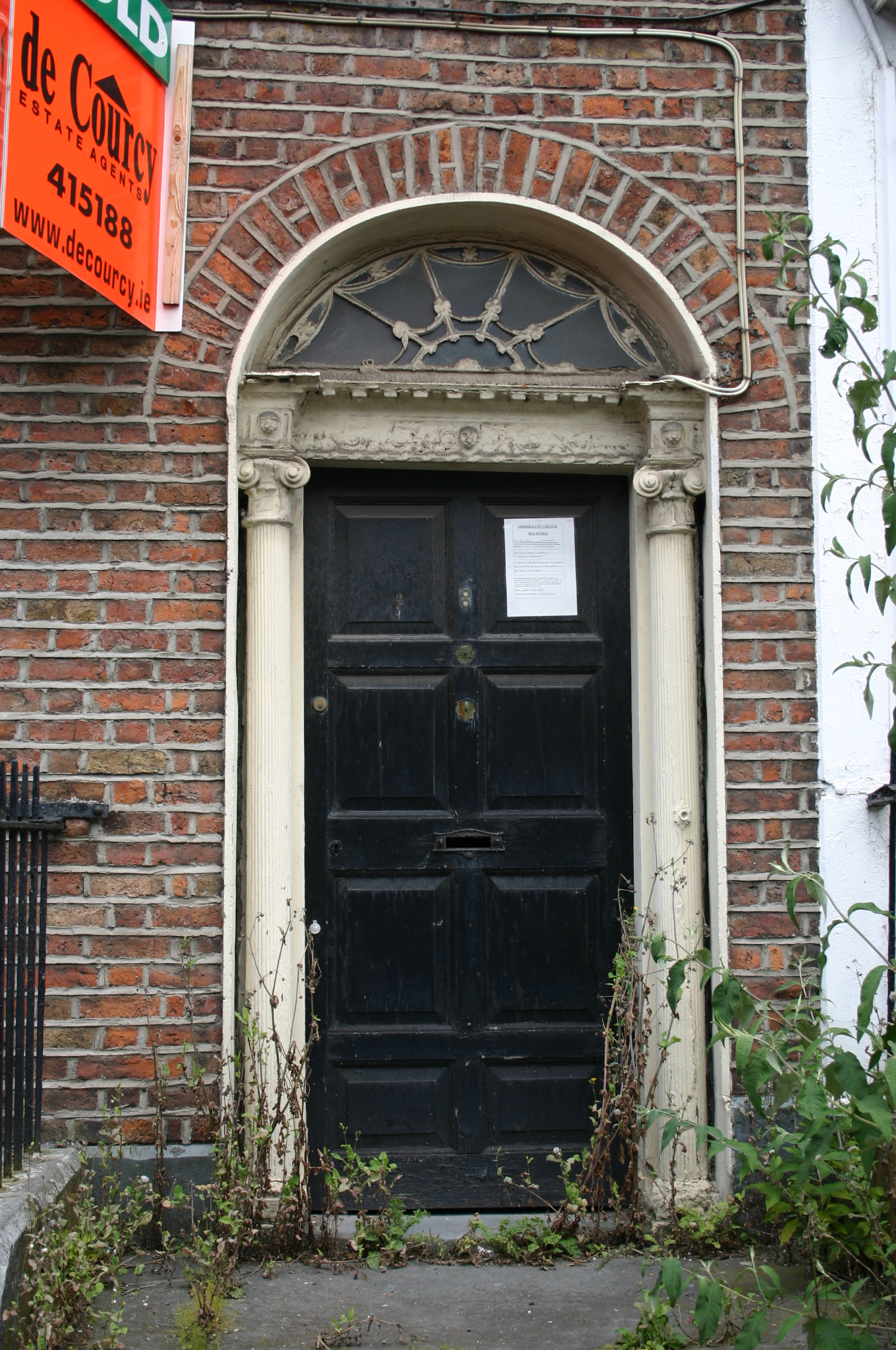 Terraced two-bay four-storey over basement brick former townhouse, built c. 1810, with a front railed basement area. Pitched roof hidden behind parapet wall with limestone coping and a pair of shared chimneystacks to the party walls. Flemish bond brick walls with cement pointing with a painted limestone plinth course over painted rendered basement walls. Brick flat-arched window openings with patent rendered reveals, limestone sills and timber sash windows c. 1940, timber casement to ground floor. Brick round-arched door opening with patent rendered reveal and a replacement timber-panelled door c. 1900. Door surround comprises a pair of quarter engaged timber Ionic columns supporting a stepped entablature with lion head motifs and modillions and decorative webbed fanlight above. Door opens onto limestone step and platform with two limestone steps, all flanked by damaged wrought-iron railings and cast-iron corner posts on a limestone plinth enclosing basement area. Coach house to rear replaced with modern red brick structure shared with that of Nos. 9, 10 and 11.