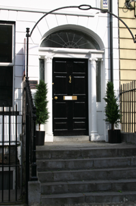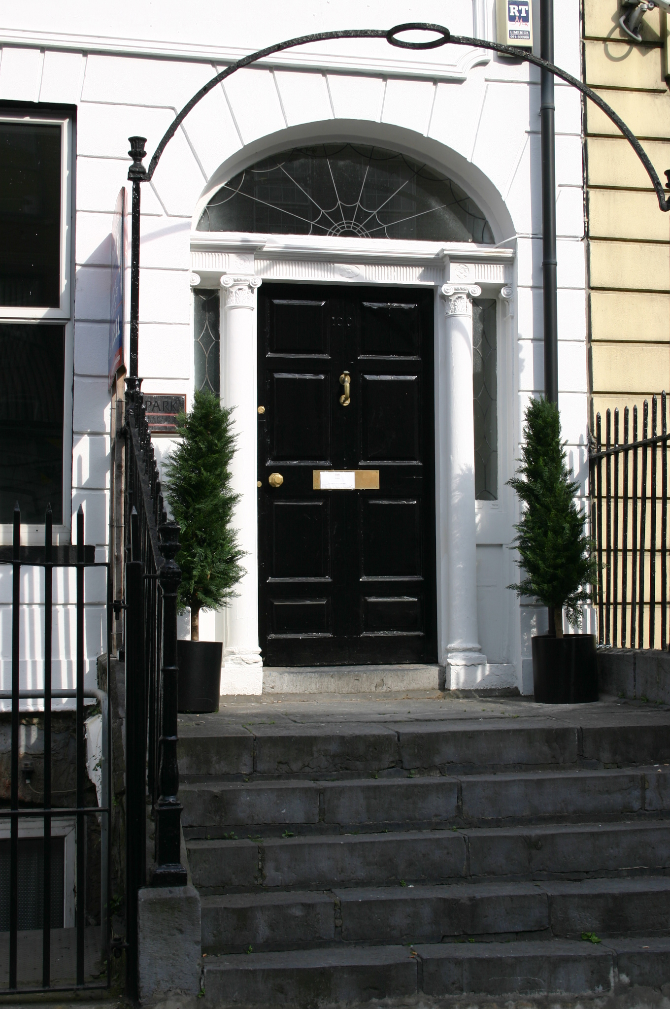 Terraced two-bay four-storey over basement brick former townhouse, built c. 1810, with a stucco-fronted ground floor added c. 1860, and a front railed basement area. Pitched artificial slate roof behind parapet with limestone coping with plastic and cast-iron rainwater goods. Red brick walls laid in Flemish bond with cement pointing and two iron wall vents. Channel rusticated rendered walls to ground floor with a cornice above and a rendered panel below. Rubble limestone walls to basement and plain rendered to rear elevation. Brick flat-arched window openings with rendered reveals, limestone sills and replacement uPVC windows throughout. Three point-arched door opening with a timber-panelled door flanked by a pair of engaged timber Ionic columns, sidelights and quarter Ionic piers supporting a stepped entablature with replacement fanlight above. Door opens onto limestone step and limestone flagged platform and five limestone steps. Wrought-iron railings with cast-iron posts on limestone plinth flank the platform with and an original wrought-iron lantern arch above. Replacement railings enclose basement area to front with an iron gate and steel steps giving access to basement area. Two square iron coal hole covers in limestone surround extending to limestone kerb. Stone coach house removed to rear with steel gates giving access to rear car park.