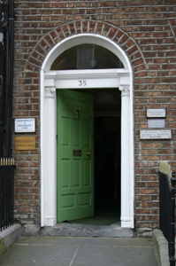 Attached two-bay three-storey over basement brick former house, built c. 1820, with a front railed basement area and a three-storey gable-ended return. Pitched slate roof with a red brick chimneystack to the east party wall and a further two rendered chimneystacks rising from the side gable and the return gable. Brick walls laid in Flemish bond with limestone coping to the rebuilt parapet wall and replacement metal rainwater goods. Painted cement rendered walls to basement and plain rendered to side and rear elevations. Brick flat-arched window openings with patent rendered reveals, limestone sills and uPVC windows throughout. Brick round-arched door opening with moulded reveals and a replacement timber-panelled door flanked by pair of timber engaged reeded Ionic columns supporting a stepped entablature and glazed overlight. Door opens onto limestone step and limestone platform flanked by wrought-iron railings and cast-iron corner posts on limestone plinth enclosing basement area.