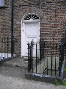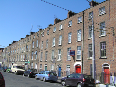 Terraced three-bay four-storey over basement brick townhouse, built c. 1820, and distinguished by a large elliptical carriage arch to ground floor, single-bay four-storey return and a two-storey extension to the upper two floors over the arch, c. 2000. Pitched artificial slate roof with a brick chimneystack to both party walls. Red brick walls laid in Flemish bond with cement pointing with covered coping to parapet wall. Gauged brick flat-arched window openings with patent reveals, painted stone sills and uPVC windows. Modern steel balconies to first floor windows. Gauged brick round-arched door opening with replacement timber door, surround and fanlight, opening onto limestone platform flanked by original spear-headed wrought-iron railings and cast-iron corner rail posts on limestone plinth, the return enclosing a small basement area. Gauged brick elliptical carriage arch spanning two bays, partially blocked-up with rendered walls to form smaller opening with steel gates giving access to rear, providing access to rear sites of entire terrace.