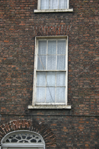End-of-terrace two-bay three-storey over basement red brick house, built c. 1850, with a two-storey over basement return to rear. Pitched artificial slate roof concealed to front behind parapet wall, having terracotta ridge tiles, and rendered chimneystack to party wall and partially rendered red brick chimneystack to gabled external wall having moulded clay pots. Red brick front and side elevation laid in Flemish bond with lime mortar pointing; rendered façade basement level and painted plinth course delineating ground floor level; lead flashed parapet coping; render finish to ground level of side elevation and rendered rear and return elevation. Square-headed window openings, red brick flat arches, patent rendered reveals, painted limestone sills; original six-over-six timber sash windows to façade and rear elevation, with one uPVC casement windows. Three-centred arch door opening, with red brick arch, patent rendered reveals, and inset timber doorcase comprising flat-panelled uprights, profiled console brackets joined by profiled lintel, with original webbed fanlight above; flat-panelled timber door with two vertical format panels retaining historic Wellington door knocker. Limestone flagged front door platform bridges basement area, with historic cast-iron bootscraper. Basement area enclosed by limestone plinth wall with wrought-iron railings having Neo-classical cast-iron rail posts with pineapple finials and wrought-iron arrow head railing finials. Intact rubble limestone rear site boundary wall.