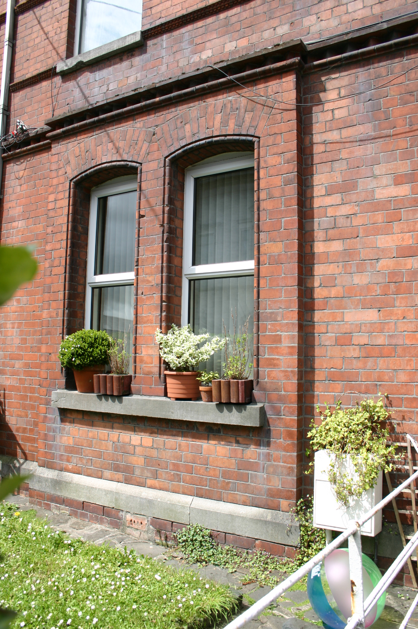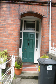 Terraced two-bay two-storey red brick former house, built c. 1890, with centrally-placed half-dormer attic window to second floor level flush with the facade. Two-storey return to rear. Pitched artificial slate roof with terracotta ridge comb tiles; intersecting secondary dormer gable roof structure; red brick chimneystacks to north and south party walls, having corbelled eaves cornice and elaborately detailed red brick stringcourse. Gabled return roof structure with shouldered chimneystack flush with gable apex. Machine made red brick walls laid in English garden wall bond rising from limestone ashlar plinth course. Elaborately detailed moulded red brick courses comprising dog-tooth brick course delineating first floor level, and a moulded stringcourse delineating first and dormer second floor sill levels, window arch level. An additional stringcourse is aligned with the meeting of the upper and lower sash windows at first floor level. Corbelled brick eaves course rising along gable eaves, supporting replacement uPVC rainwater goods. Squared and snecked rubble limestone rear elevation and red brick south-facing elevation to return. Segmental-arch window openings, paired at ground floor level set in shallow projecting bay, with bull nose moulded reveals (at ground floor level only), shared limestone sills and original uPVC windows throughout. Segmental-arched porch door opening with red brick segmental arch, bull nose moulded reveals, tiled entrance and porch platforms; recessed glazed timber doorcase comprising frosted glass sidelights, margin-paned overlight and original flat-panelled timber door leaf. Front site enclosed by red brick plinth wall with painted coping supporting wrought-iron railings with decorative cast-iron finials. Red brick pier with limestone capping having bull nose moulded corners supports wrought-iron gate with cast-iron finials. Rendered wall dividing front site surmounted by cast-iron cresting. Wrought-iron fence encloses front site landscape area from concrete footpath.