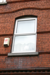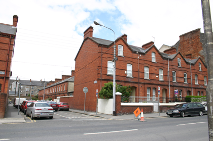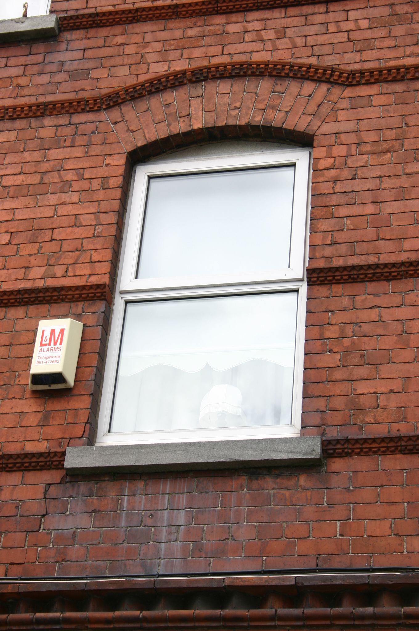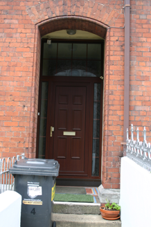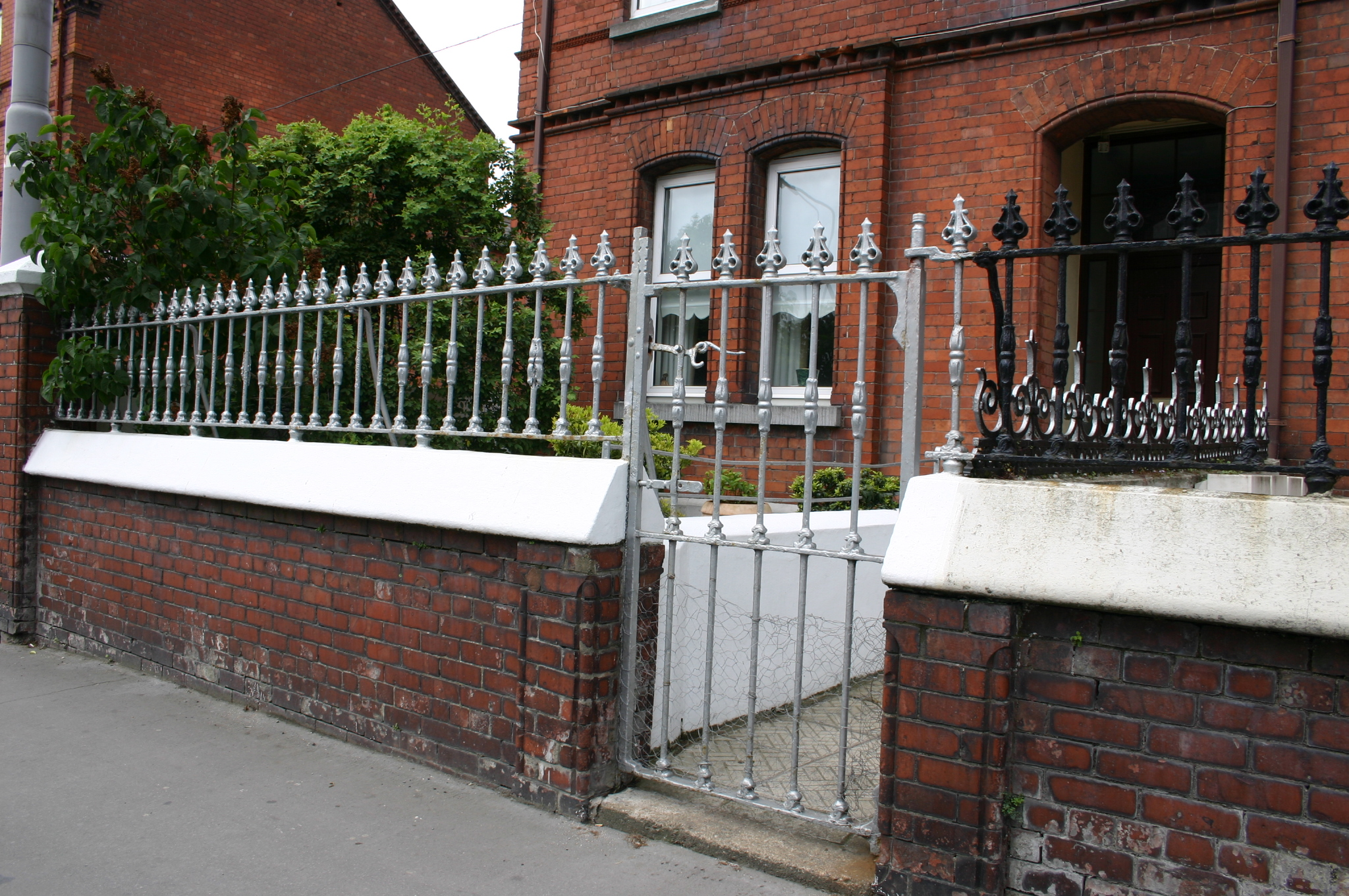 Corner-sited end-of-terrace two-bay two-storey red brick former house, built c. 1890, with a centrally-placed half-dormer attic window to second floor level flush with the facade. Two-storey return to rear with single-storey accretion c. 1970. Pitched artificial slate roof with terracotta ridge comb tiles; intersecting secondary dormer gable roof structure; red brick chimneystacks to north and south party walls, having corbelled eaves cornice and elaborately detailed red brick stringcourse. Gabled red brick south-facing side elevation laid in English garden wall bond, prolonged by red brick boundary wall to enclose rear site. Gabled return roof structure with shouldered chimneystack flush with gable apex. Machine made red brick walls laid in English garden wall bond rising from limestone ashlar plinth course. Elaborately detailed moulded red brick courses comprising dog-tooth brick course delineating first floor level, and a moulded stringcourse delineating first and dormer second floor sill levels, window arch level. An additional stringcourse is aligned with the meeting of the upper and lower sash windows at first floor level. Corbelled brick eaves course rising along gable eaves, supporting replacement uPVC rainwater goods. Squared and snecked rubble limestone rear elevation and red brick south-facing elevation to return. Segmental-arch window openings, paired at ground floor level set in shallow projecting bay, with bull nose moulded reveals (at ground floor level only), shared limestone sills and original uPVC windows throughout. Segmental-arched porch door opening with red brick segmental arch, bull nose moulded reveals, tiled entrance and porch platforms; replacement recessed glazed uPVC doorframe and door leaf. Front site enclosed by ramped red brick plinth wall with painted coping supporting wrought-iron railings with decorative cast-iron finials. Red brick pier with limestone capping having bull nose moulded corners supports wrought-iron gate with cast-iron finials. Rendered wall dividing front site surmounted by cast-iron cresting. Wrought-iron fence on plinth wall encloses landscape area from concrete footpath to front door.