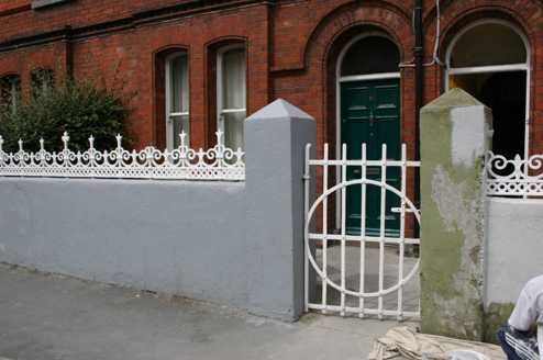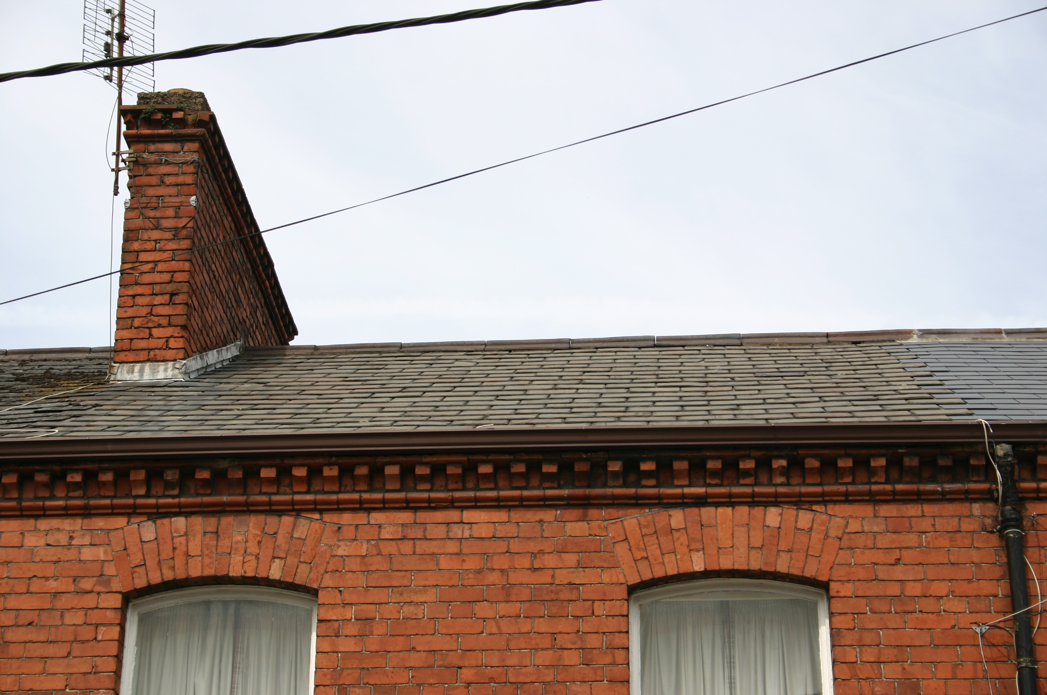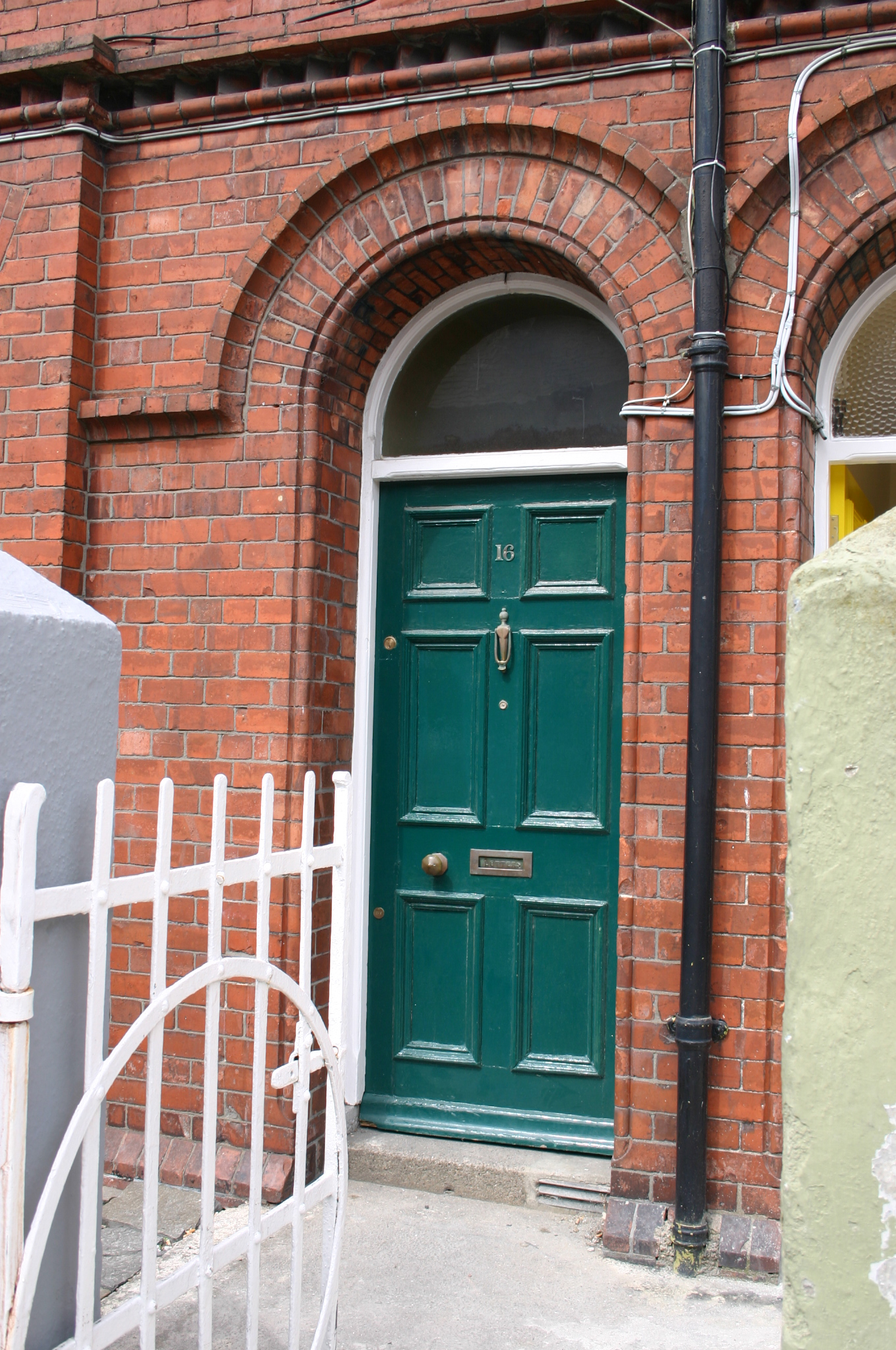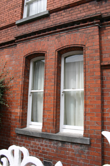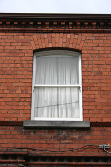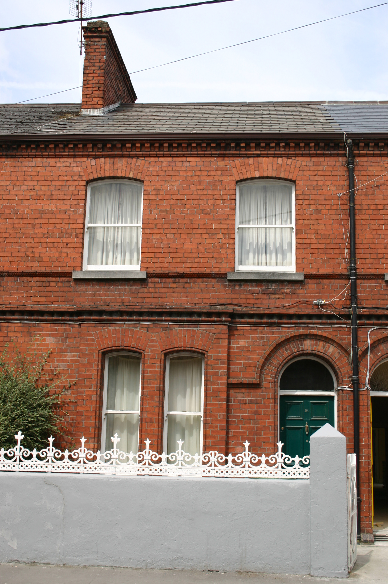 Terraced two-bay two-storey red brick house built c. 1900, and two-storey return. Pitched natural slate roof with a shared red brick chimneystack with terracotta pots to the west. uPVC gutter on dentilated red brick eaves with cast-iron downpipe. Red brick walls laid in English garden wall bond with a decorative moulded stringcourse at first floor level, an angled brick course above ground floor level and a chamfered brick course at ground level. Brick camber-arched window openings at first floor level with limestone sills and one-over-one timber sash windows. Shallow projecting bay to ground floor, with a pair of brick camber-arched window openings with bowtell surround, double limestone sill and one-over-one timber sash windows and cylinder glass. Brick round-arched door opening with brick moulding and bowtell surround, with timber-panelled door set back with overlight above. Front garden enclosed by painted rendered wall with decorative cast-iron railings and two piers with wrought-iron gate having circle design.