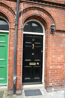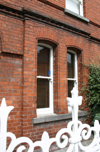 Terraced two-bay two-storey red brick house built c. 1900, with two-storey return. Pitched artificial slate roof with a shared red brick chimneystack with terracotta pots to the east. uPVC gutter on dentilated red brick eaves with cast-iron downpipe. Red brick walls laid in English garden wall bond with a decorative moulded stringcourse at first floor level, an angled brick course above ground floor level and a chamfered brick course at ground level. Brick camber-arched window openings at first floor level with limestone sills and one-over-one timber sash windows. Shallow projecting bay to ground floor, with a pair of brick camber-arched window openings with bowtel surround, double limestone sill and one-over-one timber sash windows and cylinder glass. Brick round-arched door opening with brick moulding and bowtell surround, with timber-panelled door set back having brass furniture and overlight above. Front garden enclosed by painted rendered wall with decorative cast-iron railings and two piers with wrought-iron gate having circle design.