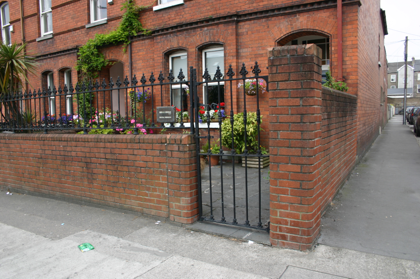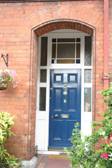 End-of-terrace two-bay three-storey gable-fronted red brick house, built c. 1900, with a two-storey return. Pitched artificial slate roof with terracotta ridge tiles and cement coping to north side gable. To this gable rises a red brick chimneystack with clay pots and dentilated cornice and stringcourse below. A larger shared chimneystack to the south with similar decoration. Cast-iron rainwater goods on dentilated eaves which follows the front and side gables. Red brick walls laid in English garden wall bond with several moulded brick stringcourses to upper floors and an angled brick course above ground floor level, and a limestone plinth course to ground level. Some rubble limestone to rear elevation. Brick segmental-arched window openings with painted limestone sills and uPVC windows throughout. Shallow projecting bay to ground floor with a pair of segmental-arched widow openings having bowtell surrounds, double limestone sill and uPVC windows. Gauged brick segmental-arched door opening with bowtell moulding and recessed timber-panelled door in timber frame with brass furniture, sidelights and square overlight above. Terracotta tiles to porch and stone paved front area enclosed by replacement brick wall with original cast-iron railings and gate.