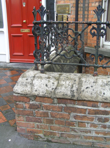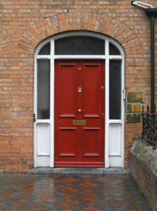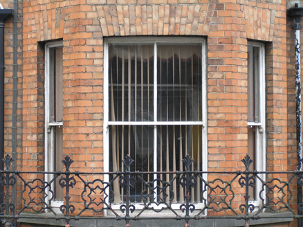 Terraced two-bay two-storey over basement red brick former house, built c. 1890, with a three-sided full-height canted bay window, a front railed basement area and three-storey return. Pitched artificial slate roof with a red brick chimneystack to west party wall and cast-iron rainwater goods. Factory-made red brick walls laid in Flemish bond rendered to basement and rear. Gauged brick flat-arched window openings with timber sash windows and limestone sills (continuous to the bay); two-over-two to first floor and front of bay window, one-over-one to side of bay and timber casement window to basement. Much cylinder glass. uPVC to rear. Gauged brick elliptical-arched door opening with stop-chamfered detailed tripartite timber frame containing replacement timber-panelled door with sidelights over panels and tripartite overlight. Door opening onto shared terracotta tiled area accessed by limestone step and flanked to west by rendered wall with elaborate cast-iron railing enclosing basement area.