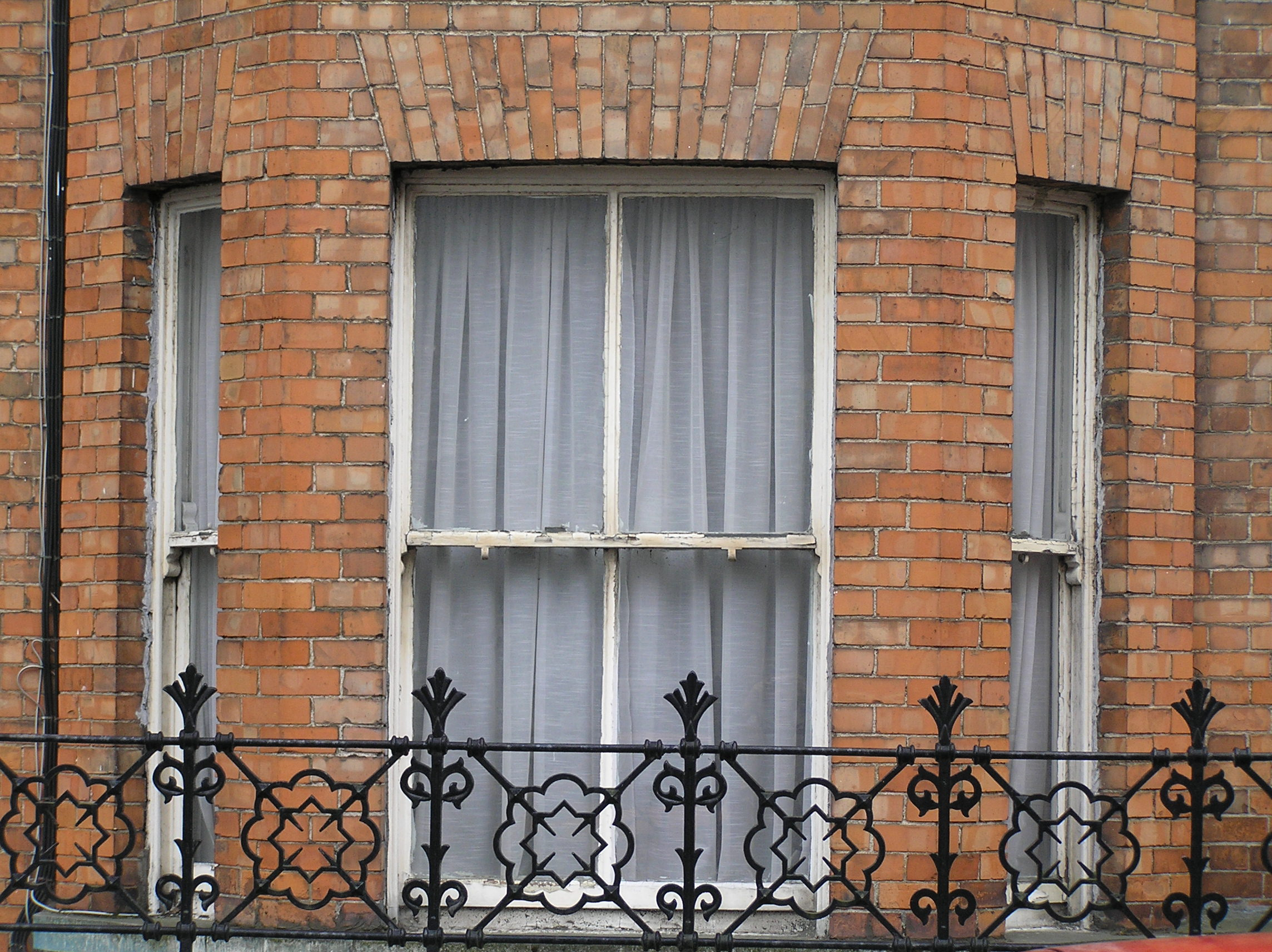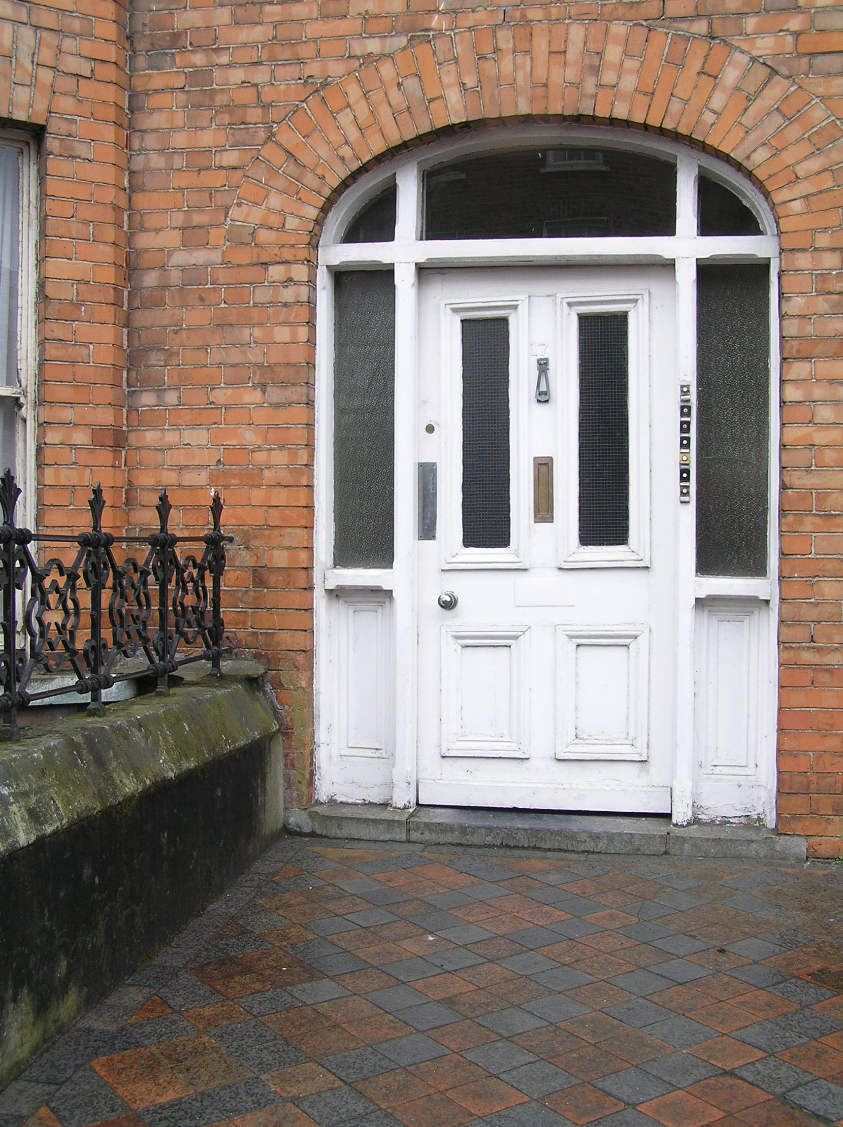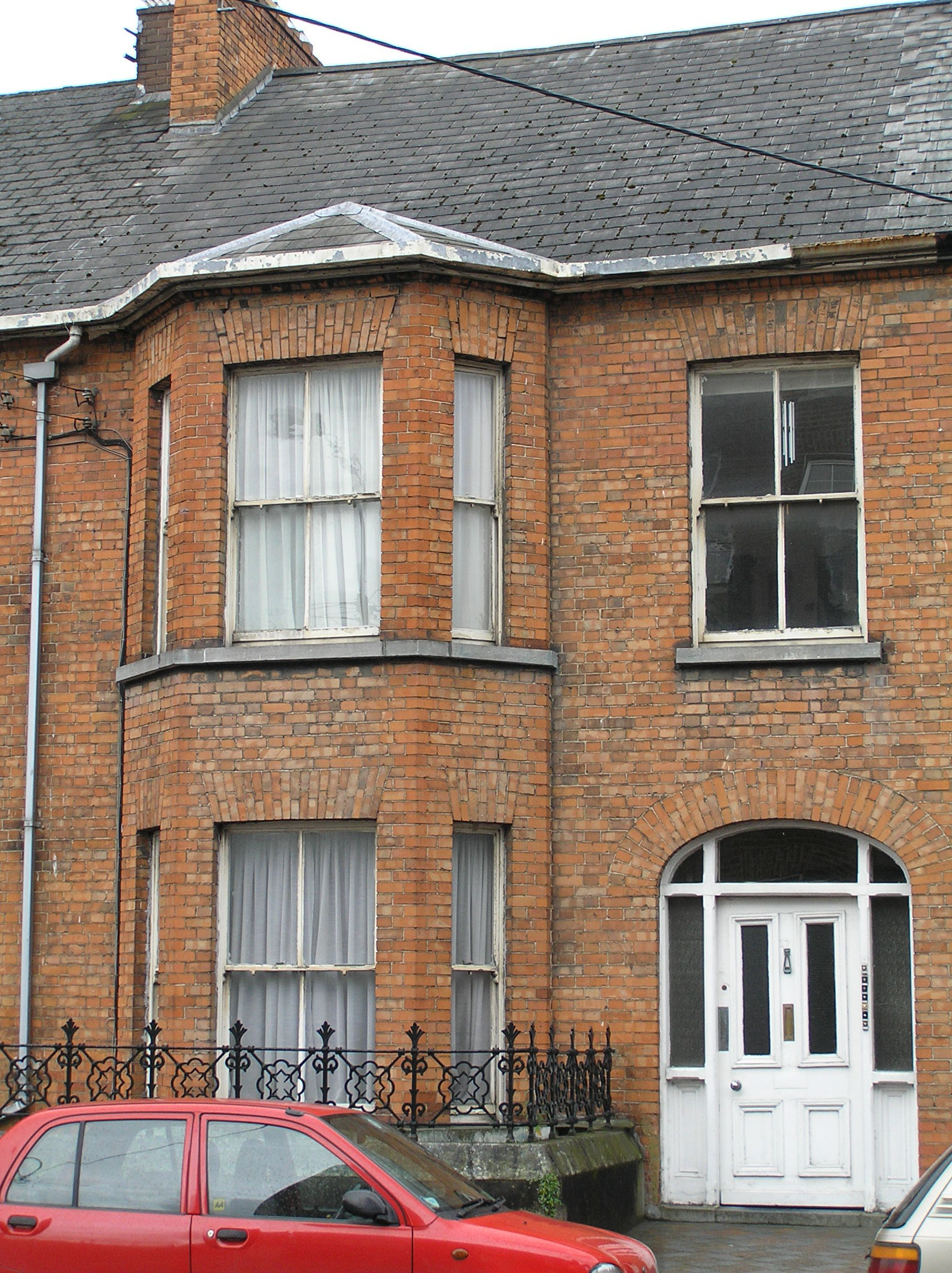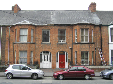 Terraced two-bay two-storey over basement red brick house, built c. 1890, with a three-sided two-storey brick canted bay window, a front railed basement area and a three-storey return. Pitched artificial slate roof with a red brick chimneystack to east party wall and metal replacement rainwater goods. Factory-made red brick walls laid in Flemish bond rendered to basement and rear. Gauged brick flat-arched window openings with timber sash windows; those to the three-side canted bay have a continuous limestone sill course. Two-over-two timber sash windows to first floor window opening and to front of bay, one-over-one to side of bay window and timber casement window to basement. Much cylinder glass. uPVC to rear. Gauged brick elliptical-arched door opening with a stop-chamfered tripartite timber frame containing a timber-panelled door with two glazed panels framed by sidelights with timber panels and overlights. Door opening onto limestone step and shared terracotta tiled area. Flanked to east by rendered wall and elaborate cast-iron railings enclosing basement area.